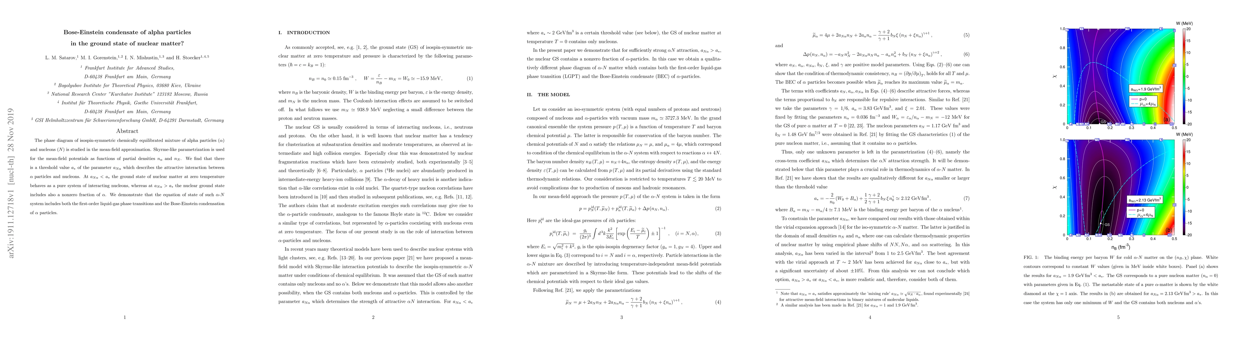 The phase diagram of isospin-symmetric chemically equilibrated mixture of alpha particles and nucleons is studied in the mean-field approximation. Skyrme-like parametrization is used for the mean-field potentials as functions of partial densities of nucleons and alphas. We find that there is a threshold value a* of the parameter a(N-alpha) which describes the attractive interaction between alpha-particles and nucleons. At a(N-alpha)a* the nuclear ground state includes also a nonzero fraction of alphas. We demonstrate that the equation of state of such alpha-N system includes both the first-order liquid-gas phase transitions and the Bose-Einstein condensation of alpha particles.