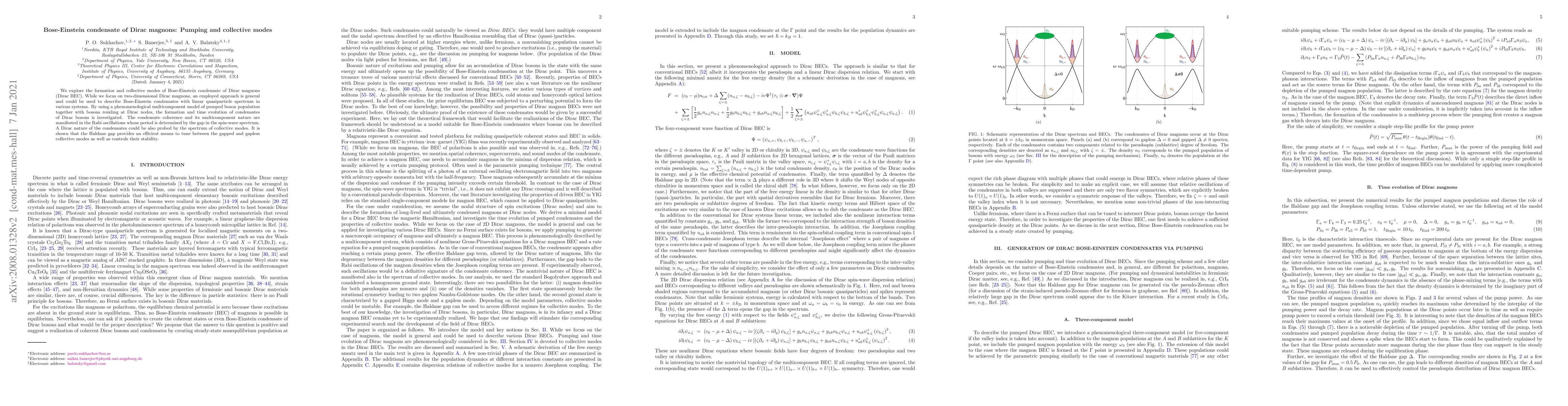 We explore the formation and collective modes of Bose-Einstein condensate of Dirac magnons (Dirac BEC). While we focus on two-dimensional Dirac magnons, an employed approach is general and could be used to describe Bose-Einstein condensates with linear quasiparticle spectrum in various systems. By using a phenomenological multicomponent model of pumped boson population together with bosons residing at Dirac nodes, the formation and time evolution of condensates of Dirac bosons is investigated. The condensate coherence and its multicomponent nature are manifested in the Rabi oscillations whose period is determined by the gap in the spin-wave spectrum. A Dirac nature of the condensates could be also probed by the spectrum of collective modes. It is shown that the Haldane gap provides an efficient means to tune between the gapped and gapless collective modes as well as controls their stability.