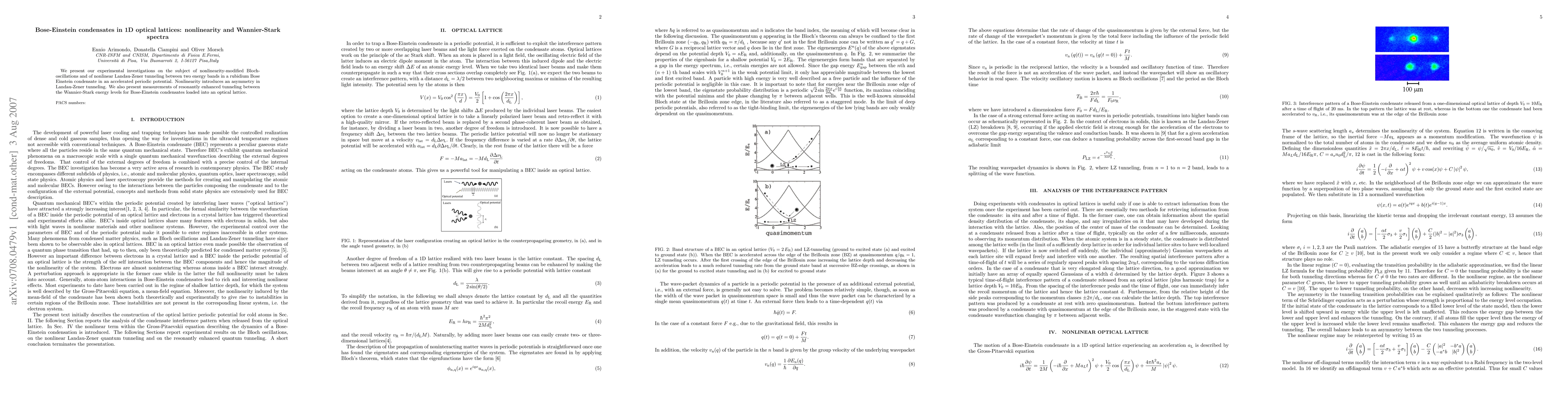 This paper explores nonlinear effects in Bose-Einstein condensates within 1D optical lattices, focusing on modified Bloch oscillations and nonlinear Landau-Zener tunneling, revealing asymmetry due to nonlinearity. It also investigates resonantly enhanced tunneling between Wannier-Stark energy levels.