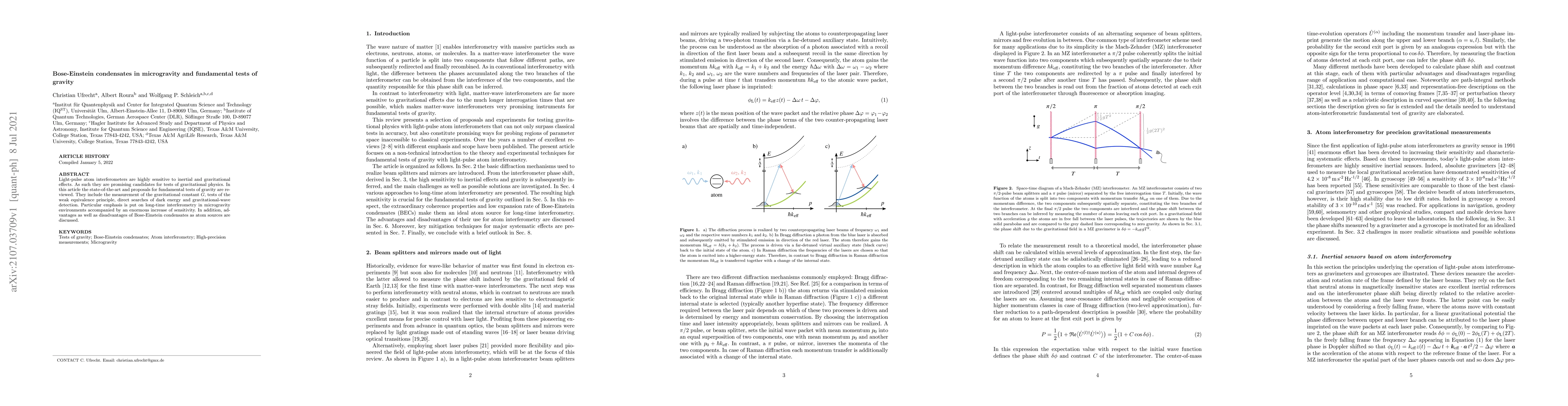 This paper reviews the state-of-the-art and future proposals for fundamental tests of gravity using light-pulse atom interferometers, emphasizing the increased sensitivity in microgravity environments, and discusses the potential and challenges of Bose-Einstein condensates in these experiments.