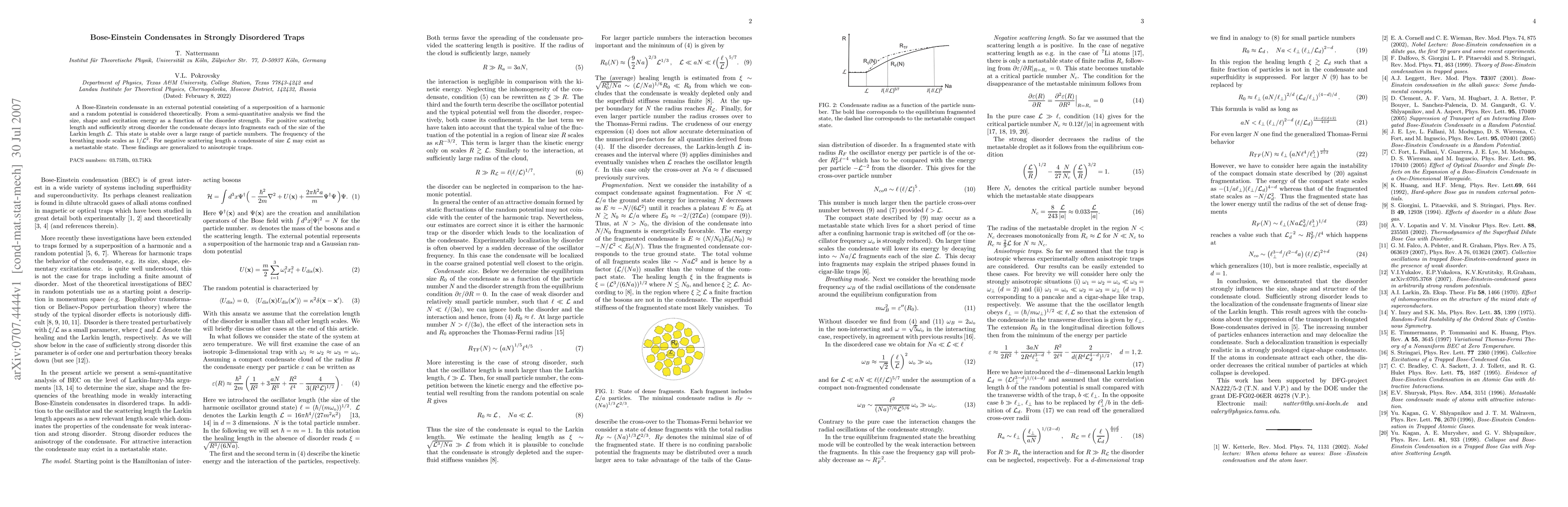 This paper investigates Bose-Einstein condensates in a combination of harmonic and random potentials, revealing that strong disorder leads to fragmentation into fragments of size ${\cal L}$ for positive scattering length, while negative scattering length may support a metastable condensate of size ${\cal L}$. The breathing mode frequency scales as $1/{\cal L}^2$.