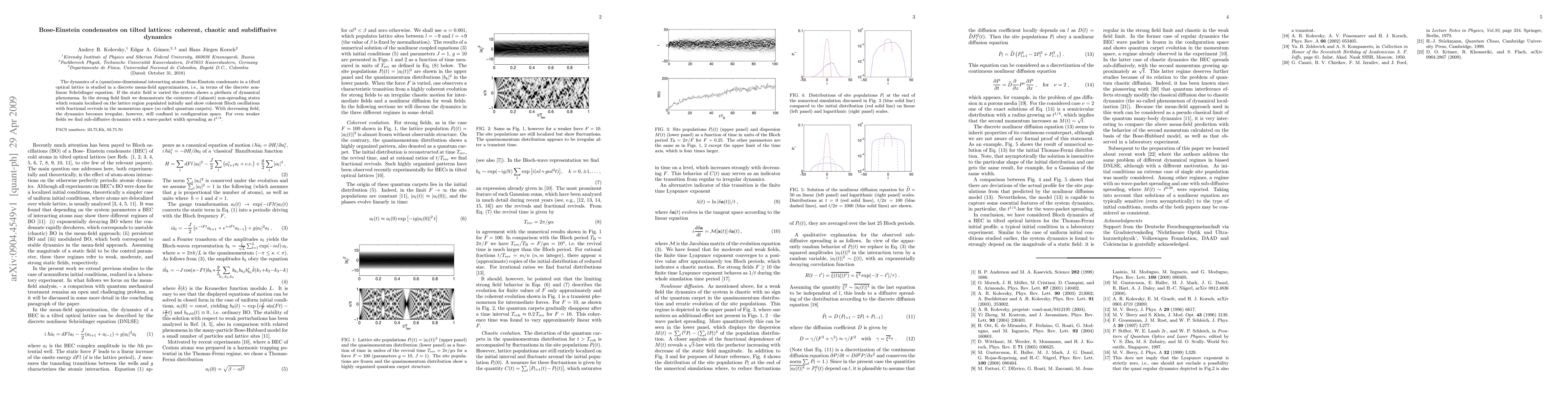 The dynamics of a (quasi)one-dimensional interacting atomic Bose-Einstein condensate in a tilted optical lattice is studied in a discrete mean-field approximation, i.e., in terms of the discrete nonlinear Schr\"odinger equation. If the static field is varied the system shows a plethora of dynamical phenomena. In the strong field limit we demonstrate the existence of (almost) non-spreading states which remain localized on the lattice region populated initially and show coherent Bloch oscillations with fractional revivals in the momentum space (so called quantum carpets). With decreasing field, the dynamics becomes irregular, however, still confined in configuration space. For even weaker fields we find sub-diffusive dynamics with a wave-packet width spreading as $t^{1/4}$.
