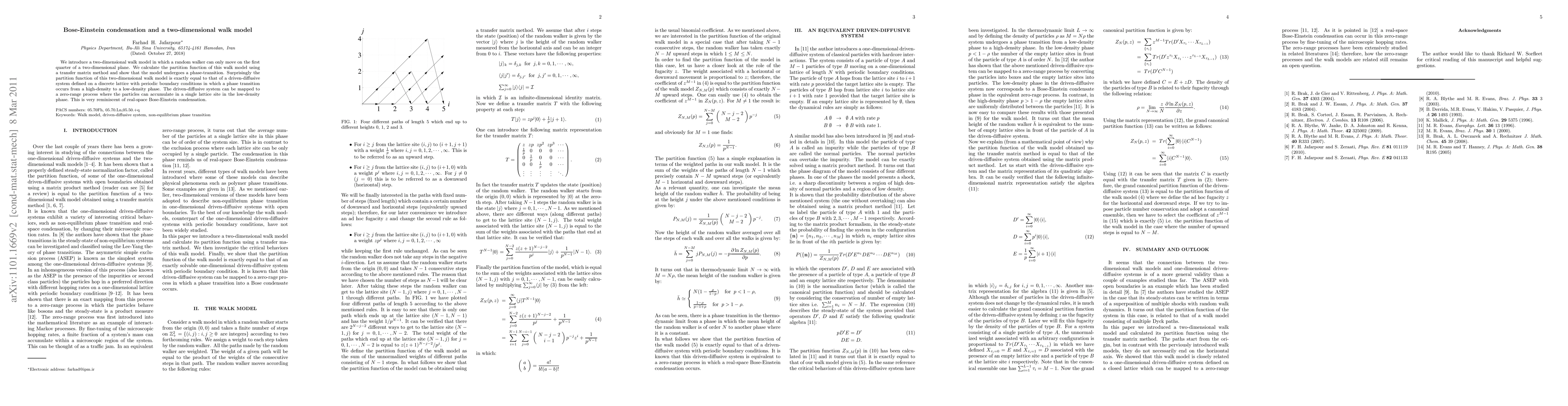 Researchers created a 2D walk model that undergoes a phase transition and found its partition function is identical to that of a driven-diffusive system, similar to real-space Bose-Einstein condensation.