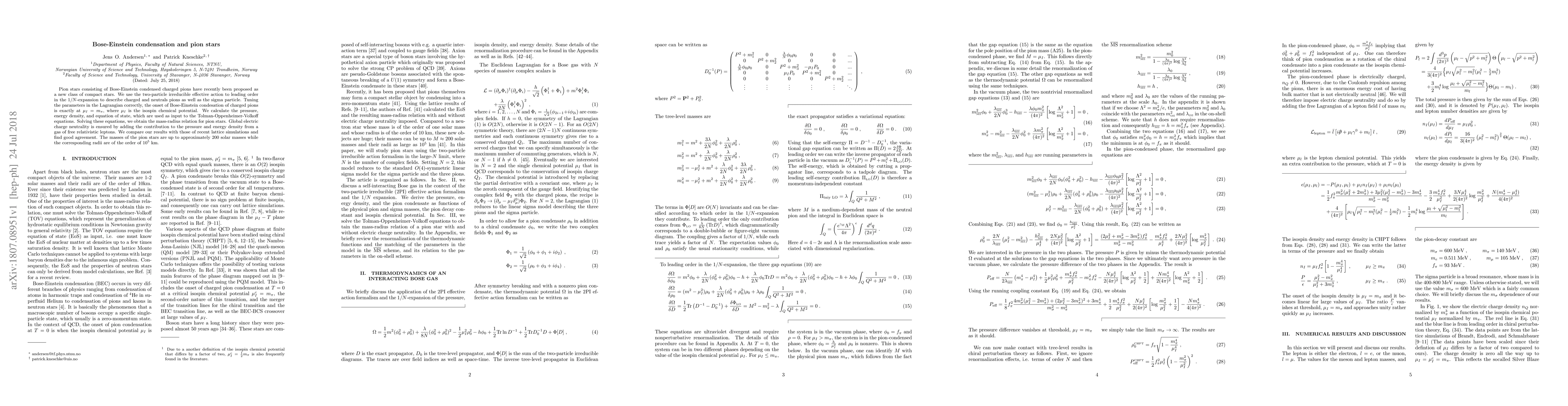Pion stars consisting of Bose-Einstein condensed charged pions have recently been proposed as a new class of compact stars. We use the two-particle irreducible effective action to leading order in the $1/N$-expansion to describe charged and neutrals pions as well as the sigma particle. Tuning the parameters in the Lagrangian correctly, the onset of Bose-Einstein condesation of charged pions is exactly at $\mu_I=m_{\pi}$, where $\mu_I$ is the isospin chemical potential. We calculate the pressure, energy density, and equation of state, which are used as input to the Tolman-Oppenheimer-Volkov equations. Solving these equations, we obtain the mass radius-relation for pion stars. Global electric charge neutrality is ensured by adding the contribution to the pressure and energy density from a gas of free relativistic leptons. We compare our results with those of recent lattice simulations and find good agreement. The masses of the pion stars are up to approximately 200 solar masses while the corresponding radii are of the order of $10^5$ km.