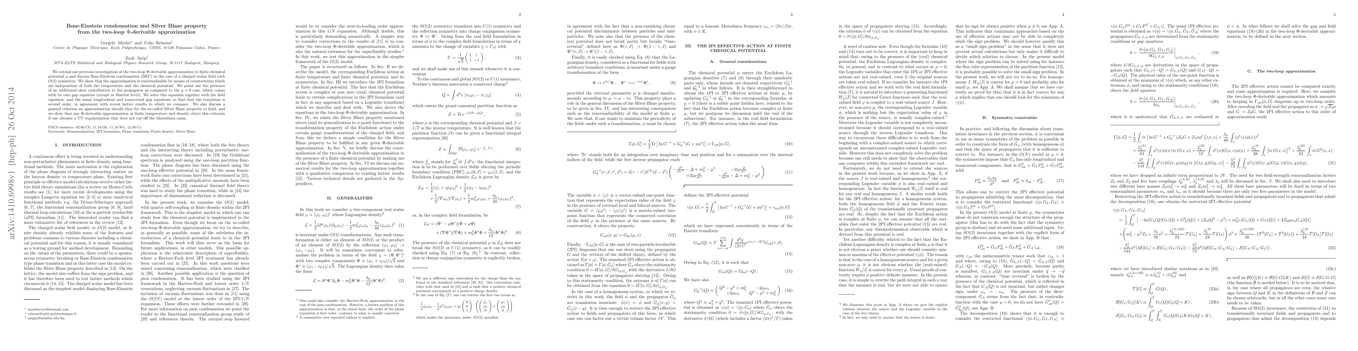 We extend our previous investigation of the two-loop $\Phi$-derivable approximation to finite chemical potential $\mu$ and discuss Bose-Einstein condensation (BEC) in the case of a charged scalar field with $O(2)$ symmetry. We show that the approximation is renormalizable by means of counterterms which are independent of both the temperature and the chemical potential. We point out the presence of an additional skew contribution to the propagator as compared to the $\mu=0$ case, which comes with its own gap equation (except at Hartree level). We solve this equation together with the field equation, and the usual longitudinal and transversal gap equations to find that the transition is second order, in agreement with recent lattice results to which we compare. We also discuss a general criterion an approximation should obey for the so-called Silver Blaze property to hold, and we show that any $\Phi$-derivable approximation at finite temperature and density obeys this criterion if one chooses a UV regularization that does not cut off the Matsubara sums.