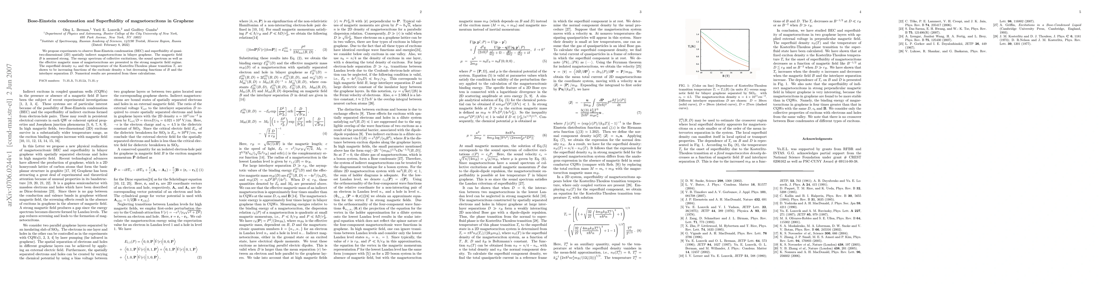 This paper proposes experiments to observe Bose-Einstein condensation and superfluidity in quasi-two-dimensional magnetoexcitons in bilayer graphene under strong magnetic fields. The study presents the energy spectrum, sound spectrum, and effective magnetic mass, showing that superfluid density and Kosterlitz-Thouless transition temperature increase with exciton density but decrease with magnetic field strength and interlayer separation.