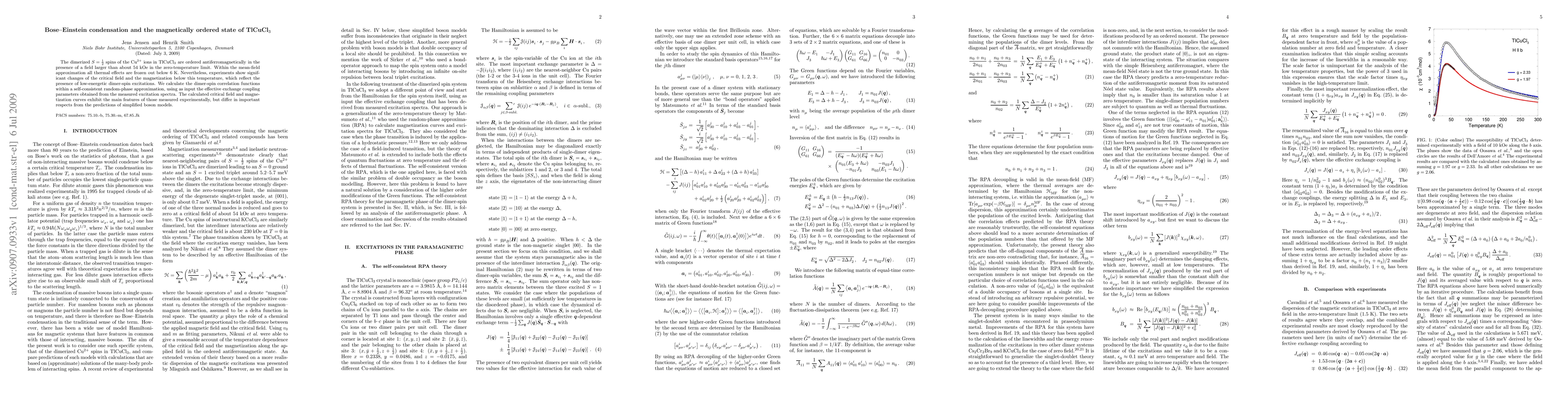 This paper investigates the magnetically ordered state of TlCuCl3, revealing antiferromagnetic ordering of Cu ions below 6 K. It highlights discrepancies between experimental observations and simplified boson models, proposing a self-consistent random-phase approximation to better describe the critical field and magnetization curves.