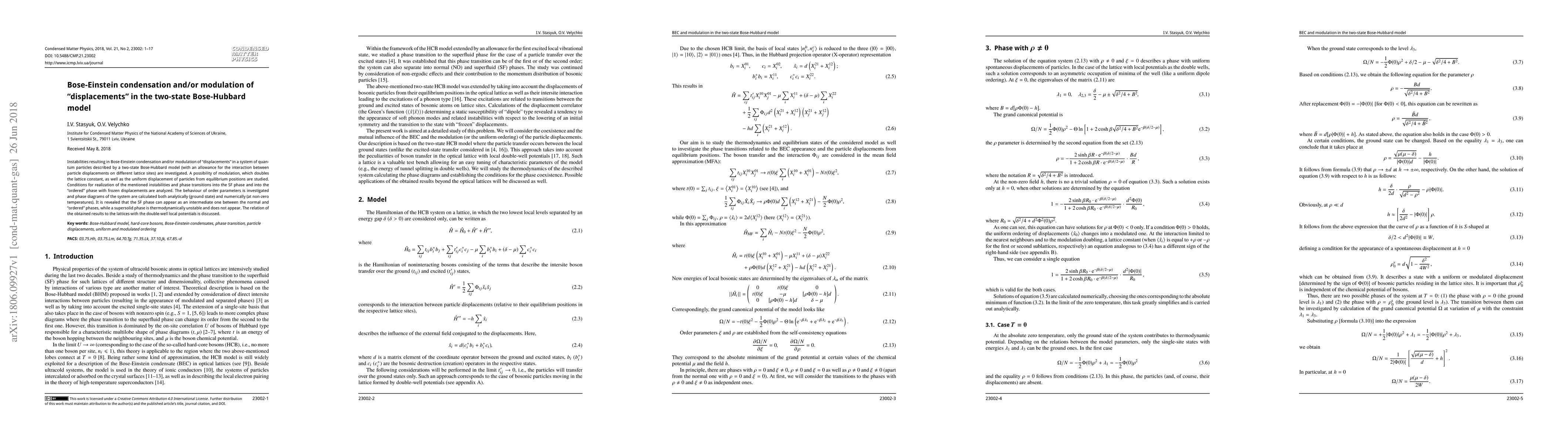 This paper investigates the instabilities leading to Bose-Einstein condensation and modulation of particle displacements in a two-state Bose-Hubbard model, analyzing phase transitions into the SF phase and an "ordered" phase with frozen displacements. It finds that the SF phase acts as an intermediate state, while a supersolid phase is thermodynamically unstable.