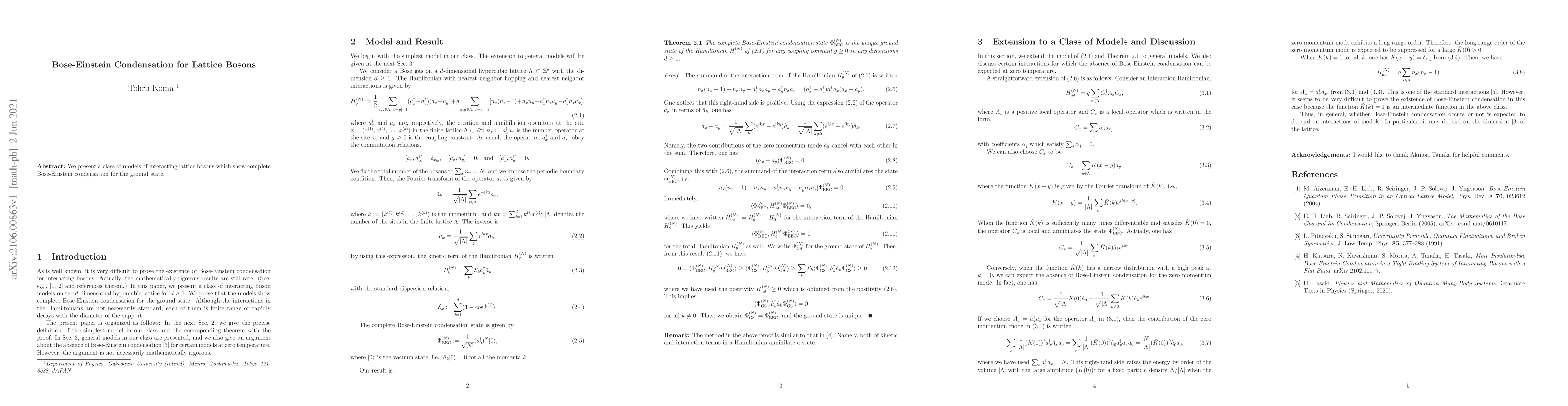 Summary: This paper introduces models of interacting lattice bosons demonstrating complete Bose-Einstein condensation in their ground states, highlighting a significant quantum phenomenon in condensed matter systems.