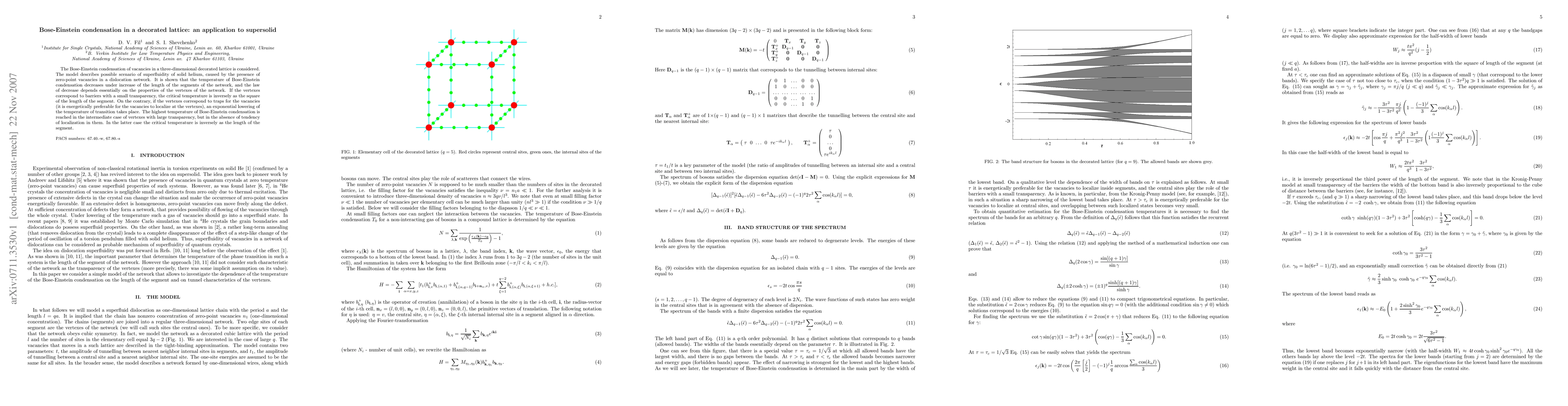 This paper explores Bose-Einstein condensation of vacancies in a decorated lattice, simulating superfluidity in solid helium. The critical temperature for condensation decreases with longer network segments, varying significantly based on the properties of the lattice vertexes: inversely proportional to the segment length squared for low-transparency barriers, and exponentially for vacancy traps.