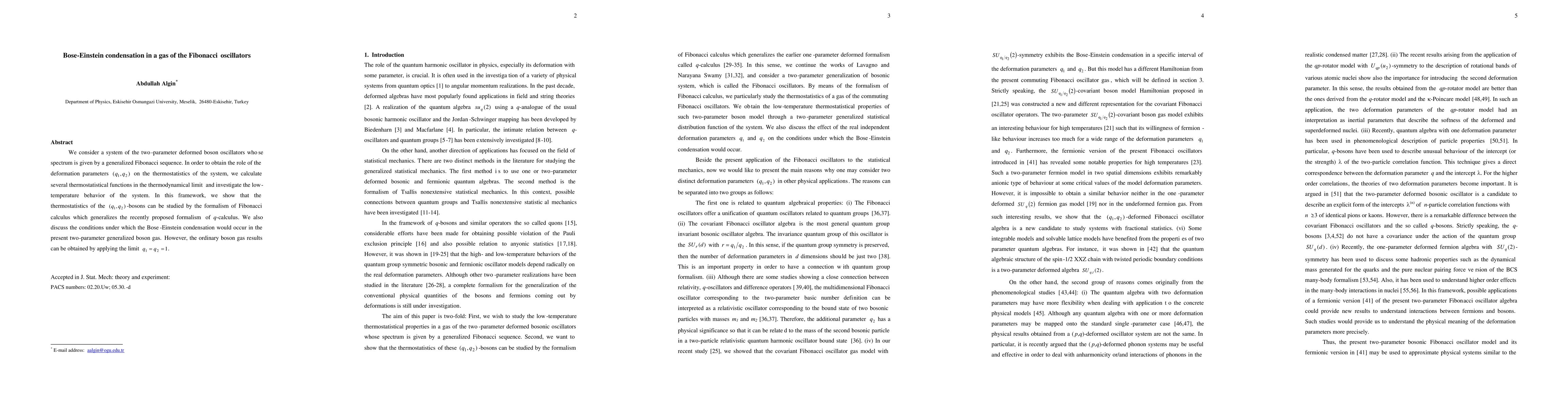 This paper explores a system of two-parameter deformed boson oscillators with a spectrum based on a generalized Fibonacci sequence, investigating the thermostatistics and conditions for Bose-Einstein condensation under varying deformation parameters. The study employs the formalism of Fibonacci calculus to generalize q-calculus and determine the low-temperature behavior of the system.