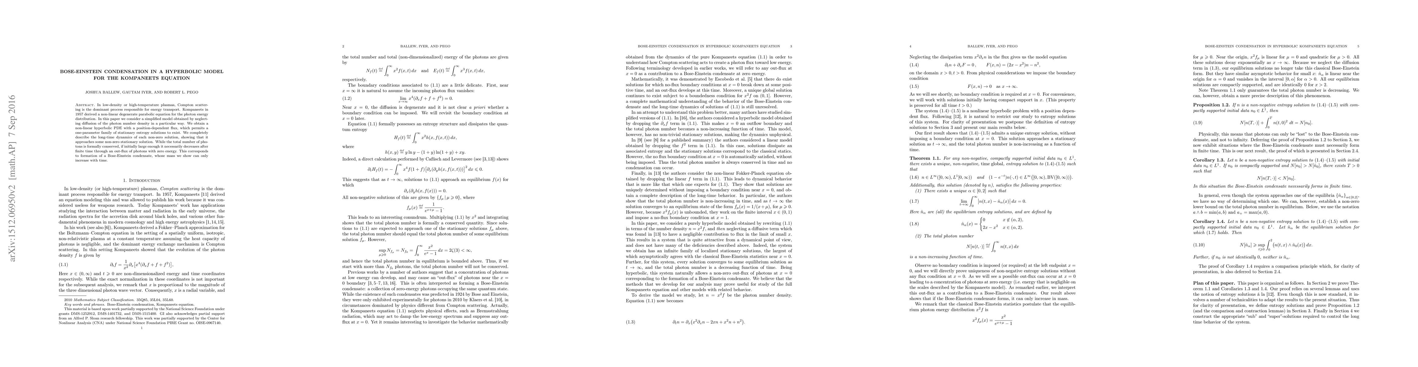 In low-density or high-temperature plasmas, Compton scattering is the dominant process responsible for energy transport. Kompaneets in 1957 derived a non-linear degenerate parabolic equation for the photon energy distribution. In this paper we consider a simplified model obtained by neglecting diffusion of the photon number density in a particular way. We obtain a non-linear hyperbolic PDE with a position-dependent flux, which permits a one-parameter family of stationary entropy solutions to exist. We completely describe the long-time dynamics of each non-zero solution, showing that it approaches some non-zero stationary solution. While the total number of photons is formally conserved, if initially large enough it necessarily decreases after finite time through an out-flux of photons with zero energy. This corresponds to formation of a Bose-Einstein condensate, whose mass we show can only increase with time.