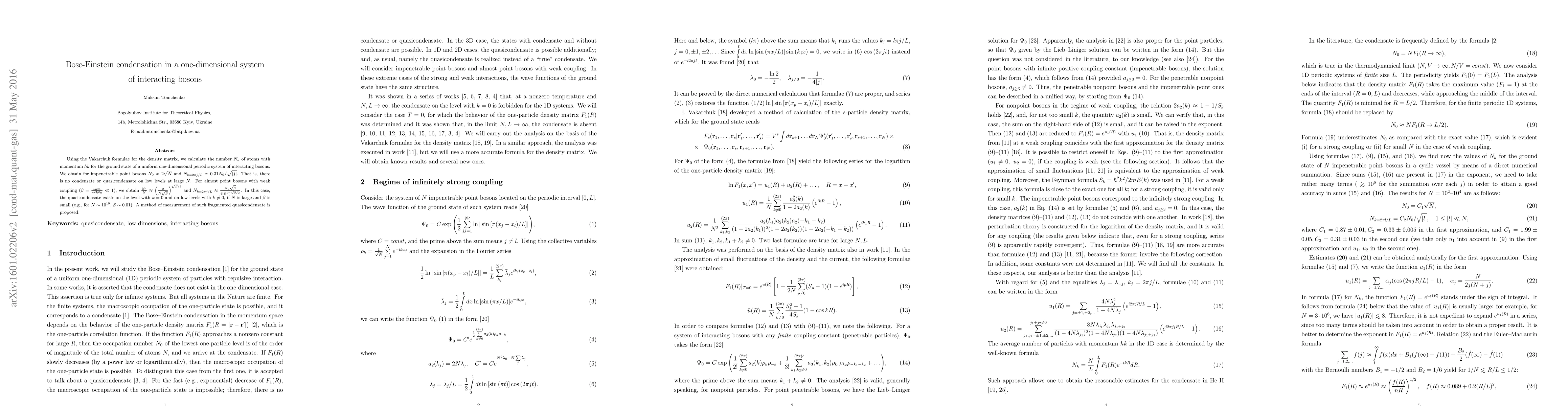 This paper investigates Bose-Einstein condensation in a one-dimensional system of interacting bosons, finding no condensate for impenetrable bosons but a fragmented quasicondensate for weakly coupled bosons under specific conditions. A proposed method for measuring this quasicondensate is also presented.