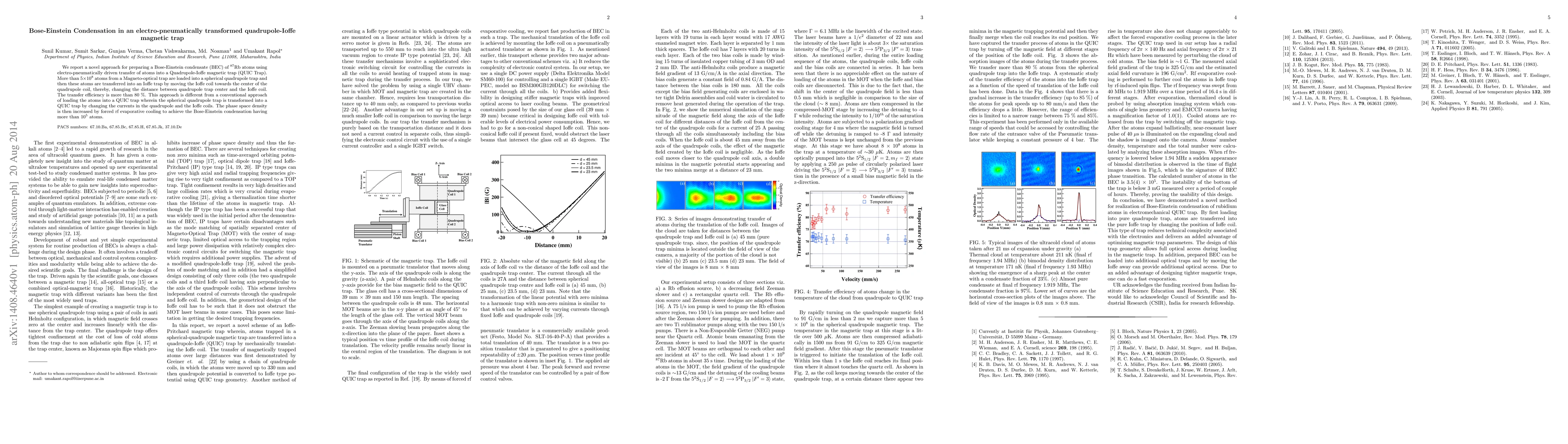 We report a novel approach for preparing a Bose-Einstein condensate (BEC) of $^{87}$Rb atoms using electro-pneumatically driven transfer of atoms into a Quadrupole-Ioffe magnetic trap (QUIC Trap). More than 5$\times$$10^{8}$ atoms from a Magneto-optical trap are loaded into a spherical quadrupole trap and then these atoms are transferred into an Ioffe trap by moving the Ioffe coil towards the center of the quadrupole coil, thereby, changing the distance between quadrupole trap center and the Ioffe coil. The transfer efficiency is more than 80 \%. This approach is different from a conventional approach of loading the atoms into a QUIC trap wherein the spherical quadrupole trap is transformed into a QUIC trap by changing the currents in the quadrupole and the Ioffe coils. The phase space density is then increased by forced rf evaporative cooling to achieve the Bose-Einstein condensation having more than $10^{5}$ atoms.