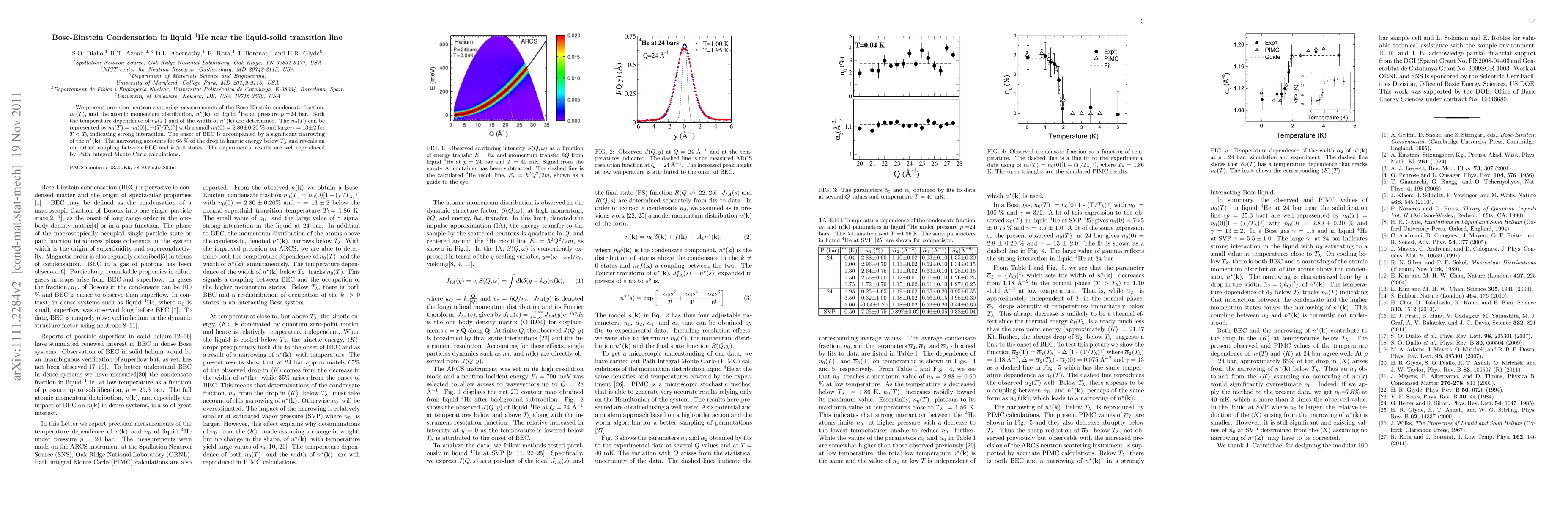 The study uses neutron scattering to measure Bose-Einstein Condensate (BEC) fraction and atomic momentum distribution in liquid $^4$He near its solid transition. Key findings include a strong interaction indicated by n0(T) = n0(0)[1-(T/Tλ)γ] with large γ, and a significant narrowing of n*(k) upon BEC onset, accounting for 65% of the energy drop. Results align with Path Integral Monte Carlo calculations.