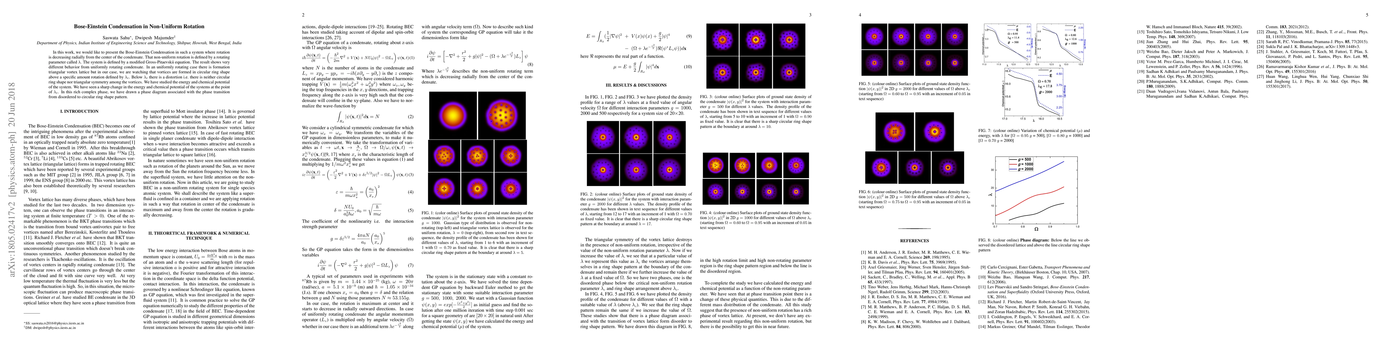 Researchers studied Bose-Einstein Condensation in a rotating system with non-uniform rotation, finding a phase transition from disordered to circular ring shape patterns at a critical rotation point $ heta_c$, characterized by sharp changes in energy and chemical potential.