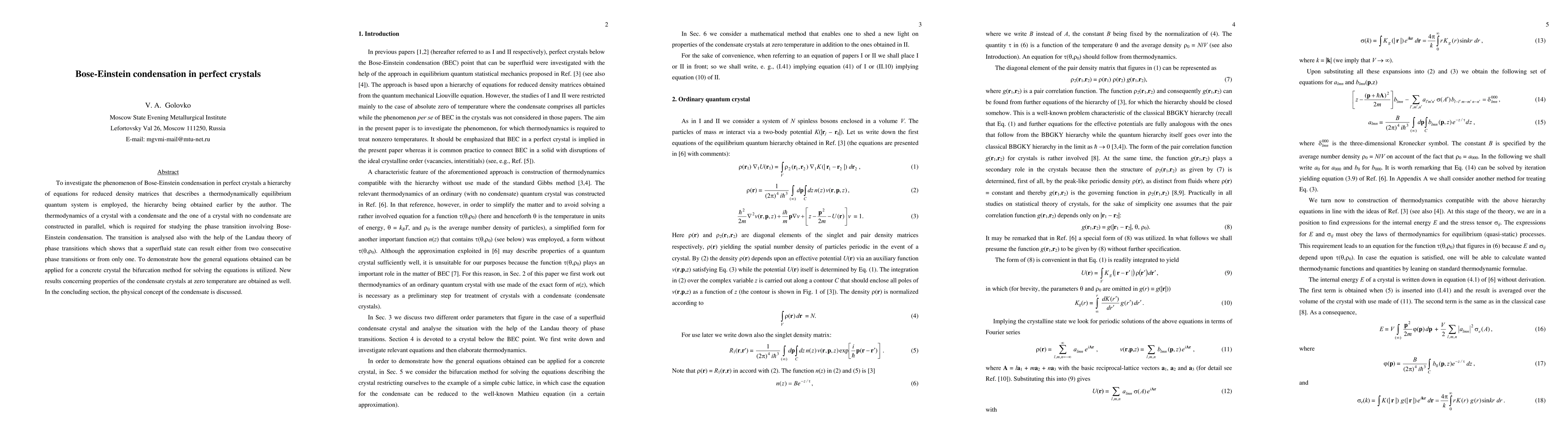 To investigate the phenomenon of Bose-Einstein condensation in perfect crystals a hierarchy of equations for reduced density matrices that describes a thermodynamically equilibrium quantum system is employed, the hierarchy being obtained earlier by the author. The thermodynamics of a crystal with a condensate and the one of a crystal with no condensate are constructed in parallel, which is required for studying the phase transition involving Bose-Einstein condensation. The transition is analysed also with the help of the Landau theory of phase transitions which shows that a superfluid state can result either from two consecutive phase transitions or from only one. To demonstrate how the general equations obtained can be applied for a concrete crystal the bifurcation method for solving the equations is utilized. New results concerning properties of the condensate crystals at zero temperature are obtained as well. In the concluding section, the physical concept of the condensate is discussed.