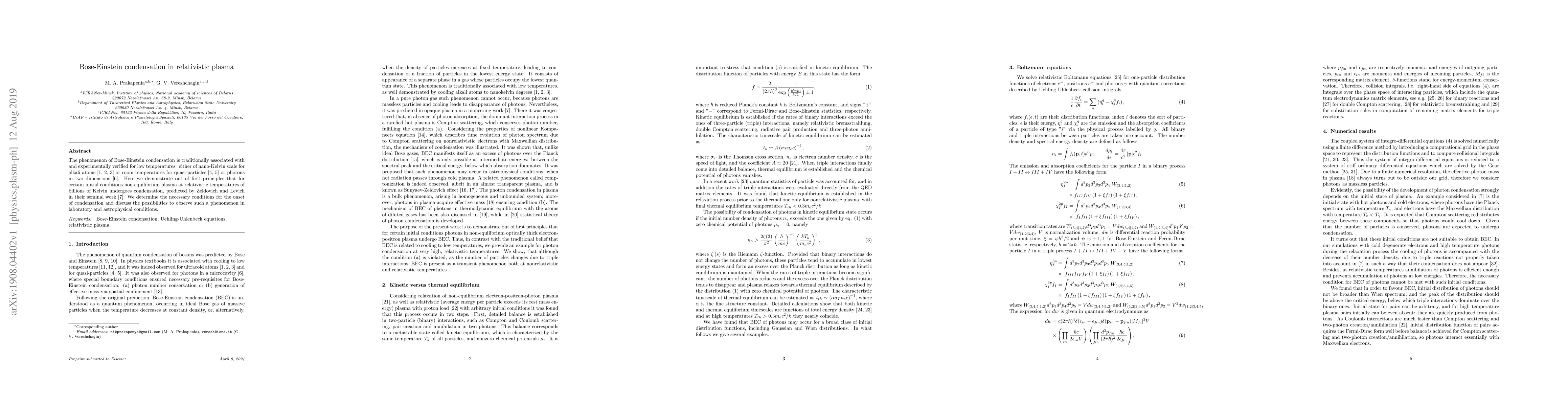 This research demonstrates that Bose-Einstein condensation can occur in relativistic plasma at extreme temperatures, predicted by early work and explored here using first principles. The study outlines conditions for condensation and discusses potential laboratory and astrophysical observations.