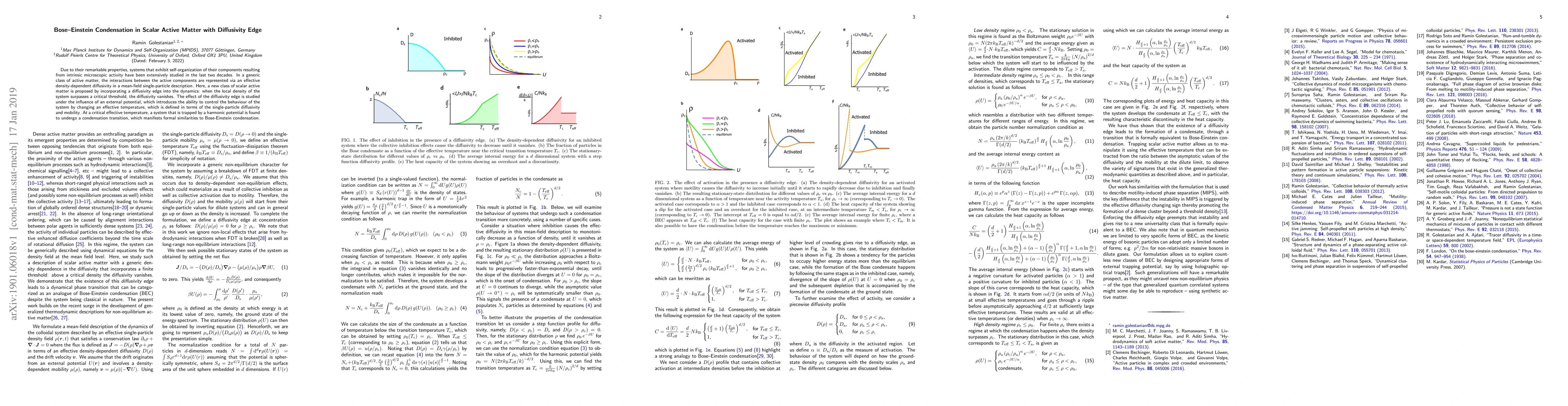 This paper proposes a new class of scalar active matter with a diffusivity edge, where diffusivity vanishes when local density exceeds a critical threshold. It explores the system's behavior under an external potential, revealing a condensation transition at a critical effective temperature, analogous to Bose-Einstein condensation.