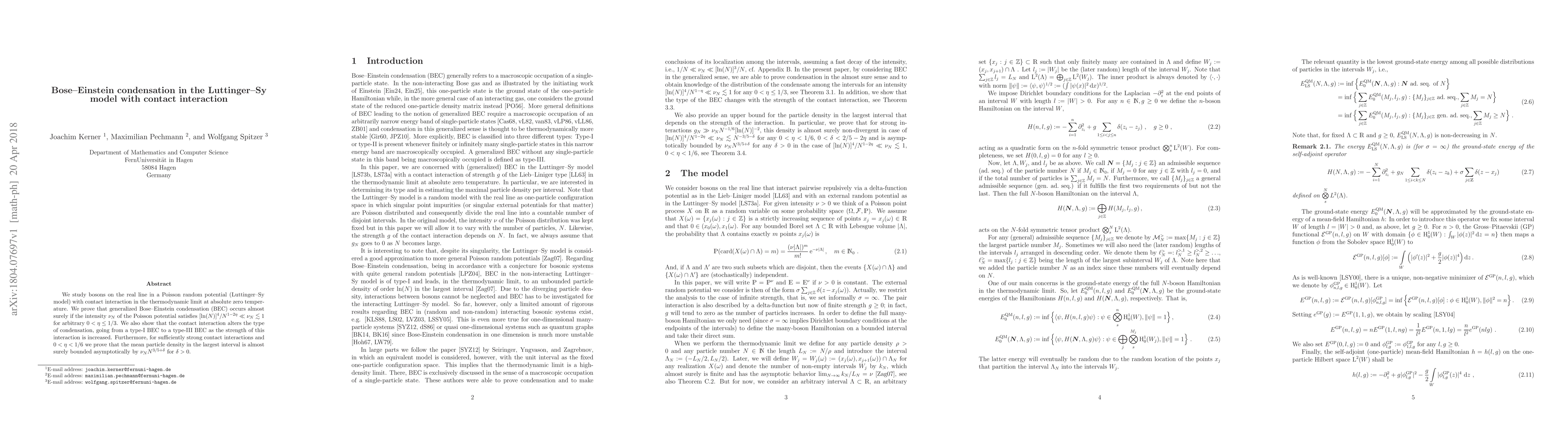 This paper investigates Bose-Einstein condensation in the Luttinger-Sy model with contact interaction, proving generalized BEC occurs under specific conditions on the Poisson potential intensity. It also demonstrates a transition from type-I to type-III BEC with increased interaction strength and bounds the mean particle density for strong interactions.