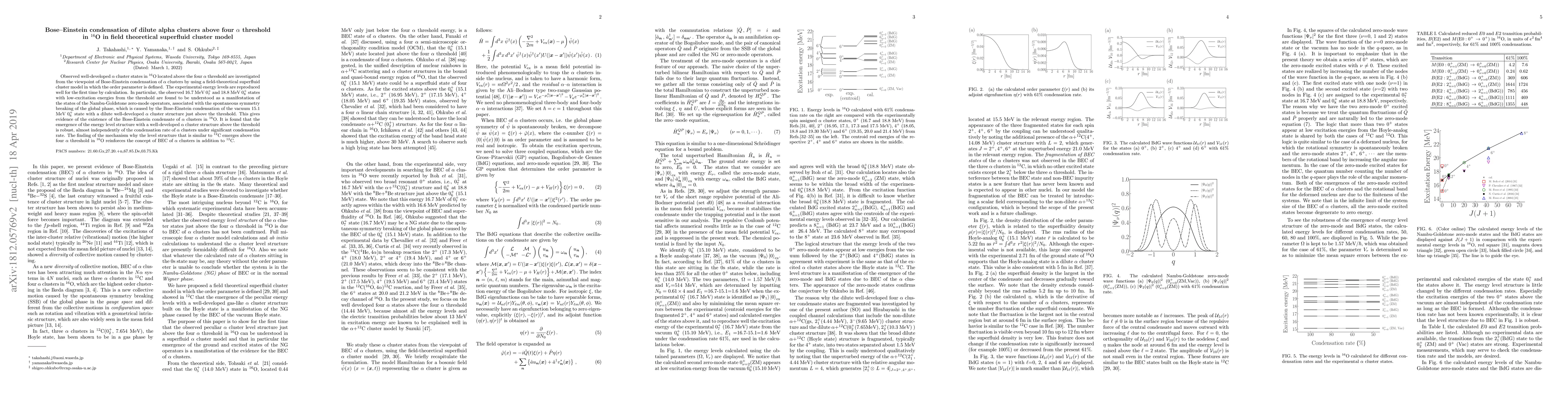 This paper investigates the Bose-Einstein condensation of $\alpha$ clusters in $^{16}$O using a field-theoretical superfluid cluster model, successfully reproducing experimental energy levels. It finds evidence of the condensate in the low-excitation states $0_7^+$ and $0_8^+$, demonstrating the robustness of the energy level structure above the four $\alpha$ threshold.