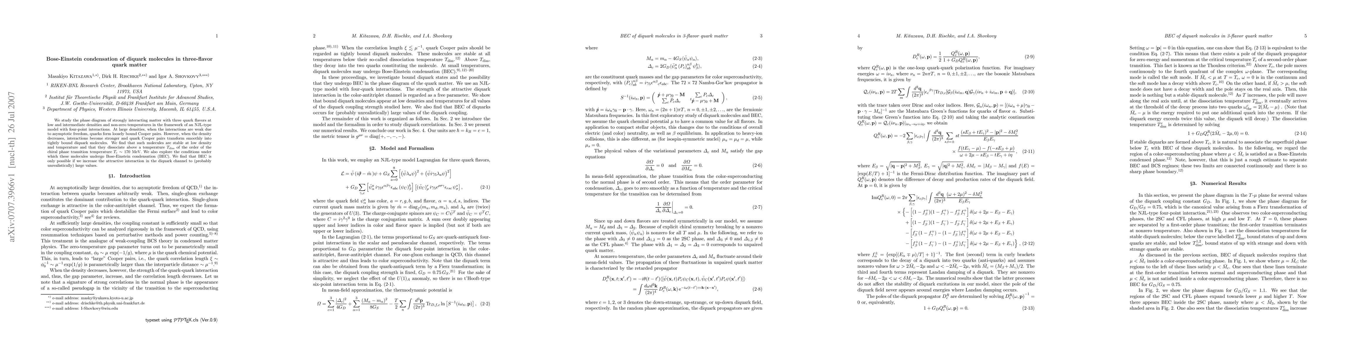 This paper investigates the phase diagram of three-flavor quark matter using an NJL-type model, finding that diquark molecules form at low densities and temperatures, and undergo Bose-Einstein condensation only under significantly enhanced attractive interactions, likely beyond realistic values.