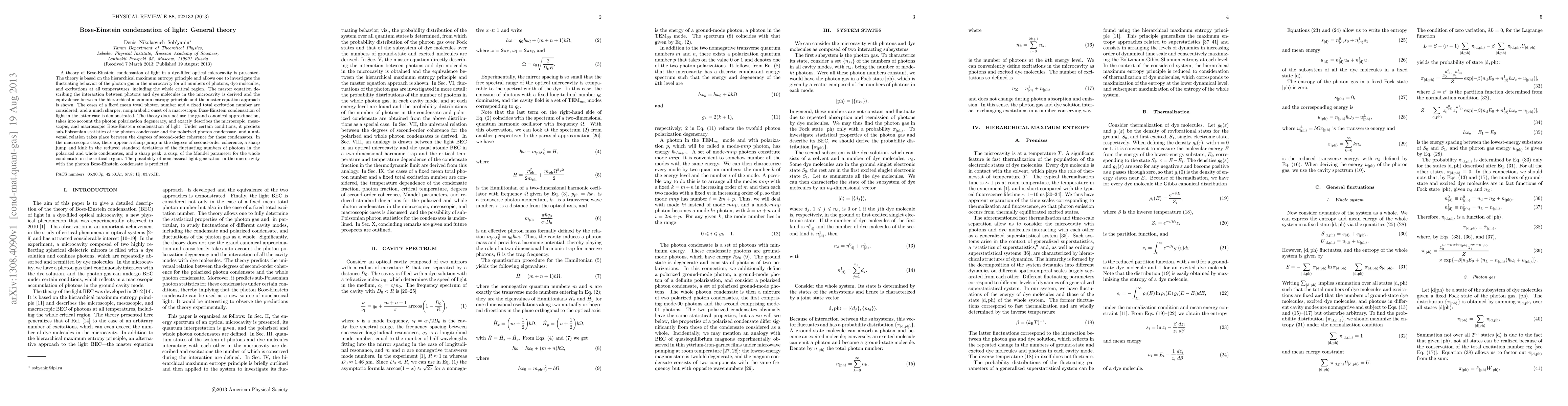 The theory of Bose-Einstein condensation of light in a dye-filled optical microcavity is presented, utilizing the hierarchical maximum entropy principle and a master equation approach to describe photon-dye interactions, accounting for all photon numbers, dye molecules, excitations, and temperatures, including the critical region.