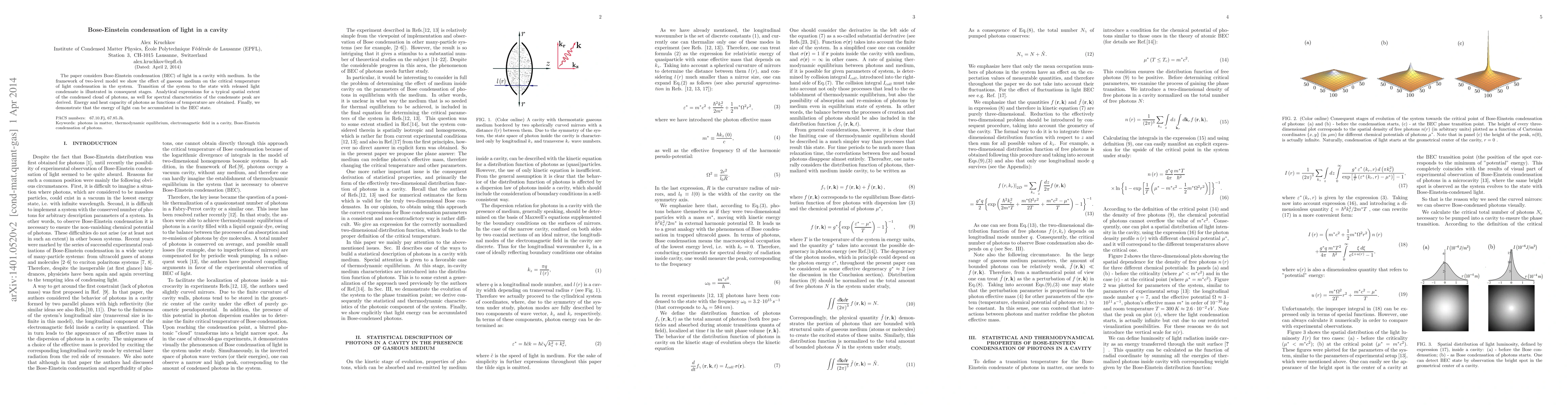 The paper presents a detailed theoretical analysis of Bose-Einstein condensation of light in a cavity with a gaseous medium, providing expressions for critical parameters and system properties.
