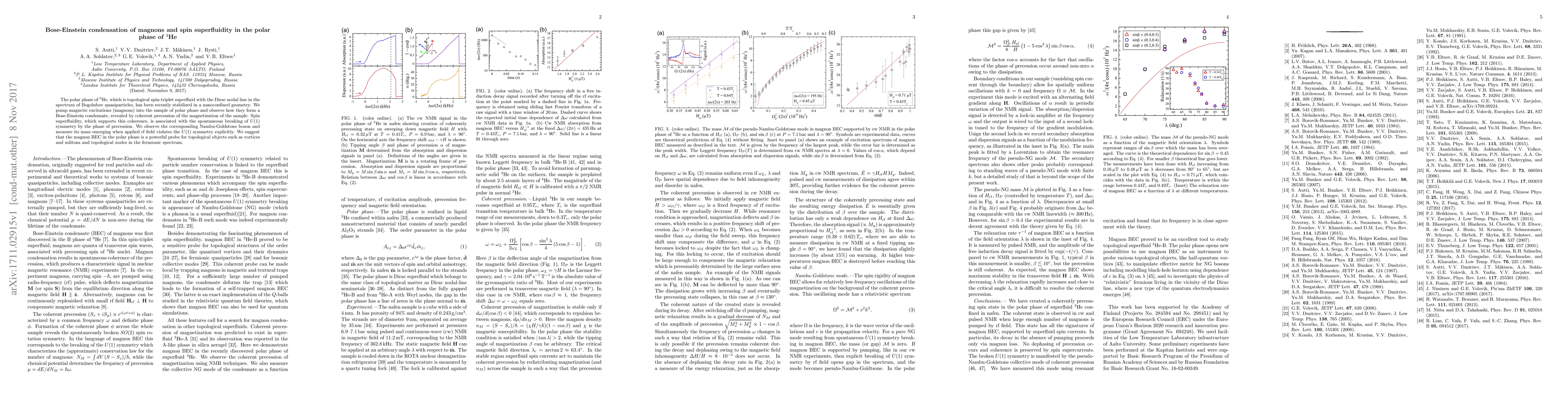 This paper investigates the Bose-Einstein condensation (BEC) of magnons in the polar phase of $^3$He, revealing coherent precession and spin superfluidity. The study identifies a Nambu-Goldstone boson linked to the U(1) symmetry breaking and suggests that magnon BEC can probe topological phenomena like vortices and nodes.