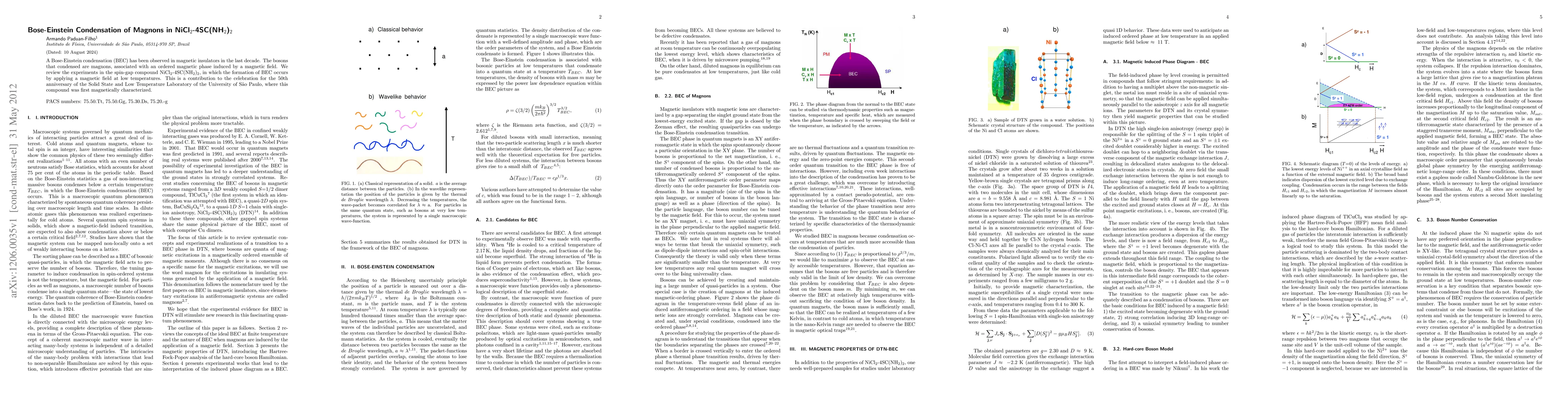 This paper reviews experiments observing the Bose-Einstein condensation of magnons in the spin-gap compound NiCl2-4SC(NH2)2, achieved by applying a magnetic field at low temperatures, marking a significant milestone in the study of magnetic insulators. This work commemorates the 50th anniversary of the Solid State and Low Temperature Laboratory of the University of São Paulo.