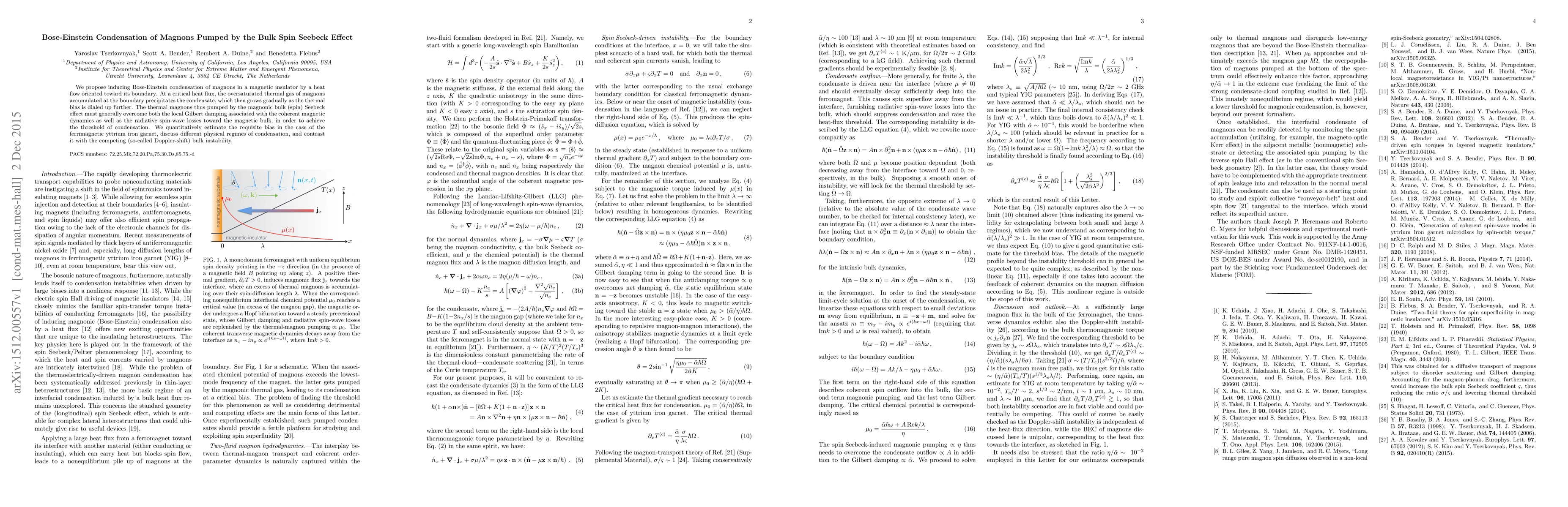 We propose inducing Bose-Einstein condensation of magnons in a magnetic insulator by a heat flow oriented toward its boundary. At a critical heat flux, the oversaturated thermal gas of magnons accumulated at the boundary precipitates the condensate, which then grows gradually as the thermal bias is dialed up further. The thermal magnons thus pumped by the magnonic bulk (spin) Seebeck effect must generally overcome both the local Gilbert damping associated with the coherent magnetic dynamics as well as the radiative spin-wave losses toward the magnetic bulk, in order to achieve the threshold of condensation. We quantitatively estimate the requisite bias in the case of the ferrimagnetic yttrium iron garnet, discuss different physical regimes of condensation, and contrast it with the competing (so-called Doppler-shift) bulk instability.