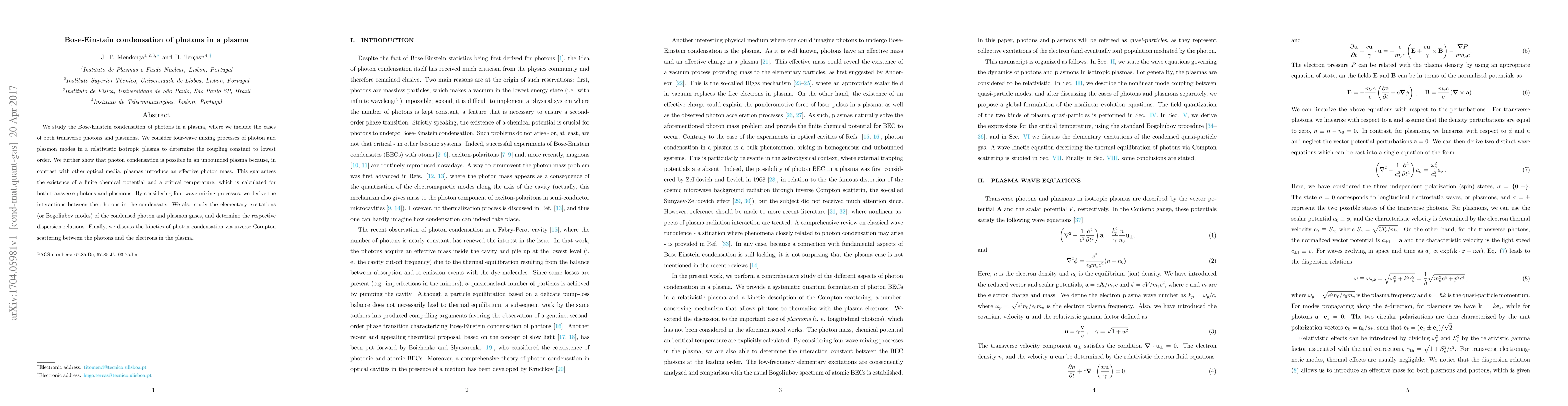 This paper investigates Bose-Einstein condensation of photons in plasmas, showing that effective photon mass due to plasma allows for a finite chemical potential and critical temperature. It explores four-wave mixing to determine interactions and dispersion relations of condensed photons and plasmons, and discusses the kinetics of condensation through inverse Compton scattering.