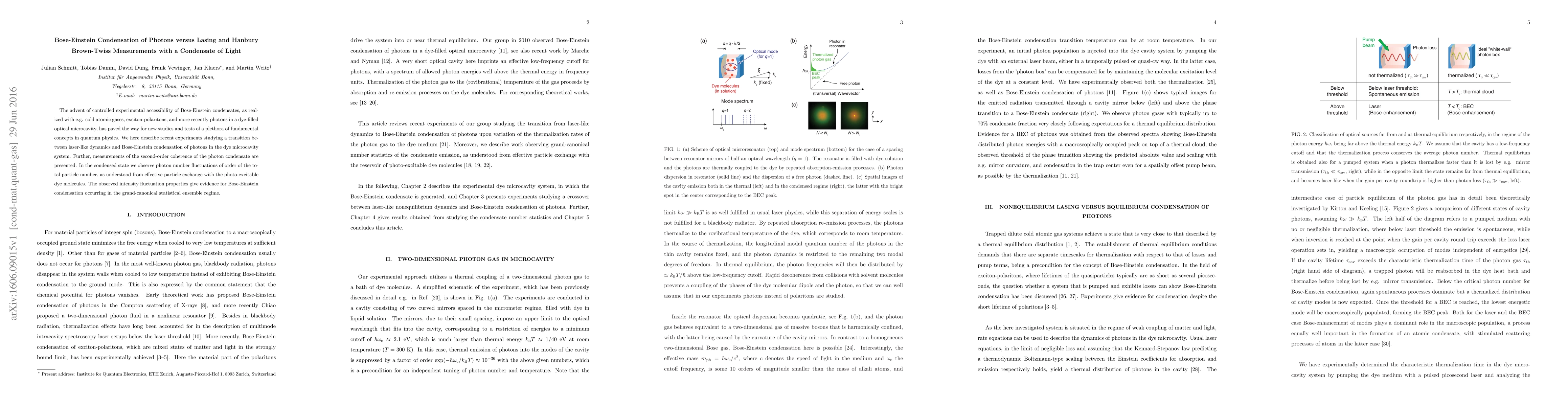The advent of controlled experimental accessibility of Bose-Einstein condensates, as realized with e.g. cold atomic gases, exciton-polaritons, and more recently photons in a dye-filled optical microcavity, has paved the way for new studies and tests of a plethora of fundamental concepts in quantum physics. We here describe recent experiments studying a transition between laser-like dynamics and Bose-Einstein condensation of photons in the dye microcavity system. Further, measurements of the second-order coherence of the photon condensate are presented. In the condensed state we observe photon number fluctuations of order of the total particle number, as understood from effective particle exchange with the photo-excitable dye molecules. The observed intensity fluctuation properties give evidence for Bose-Einstein condensation occurring in the grand-canonical statistical ensemble regime.