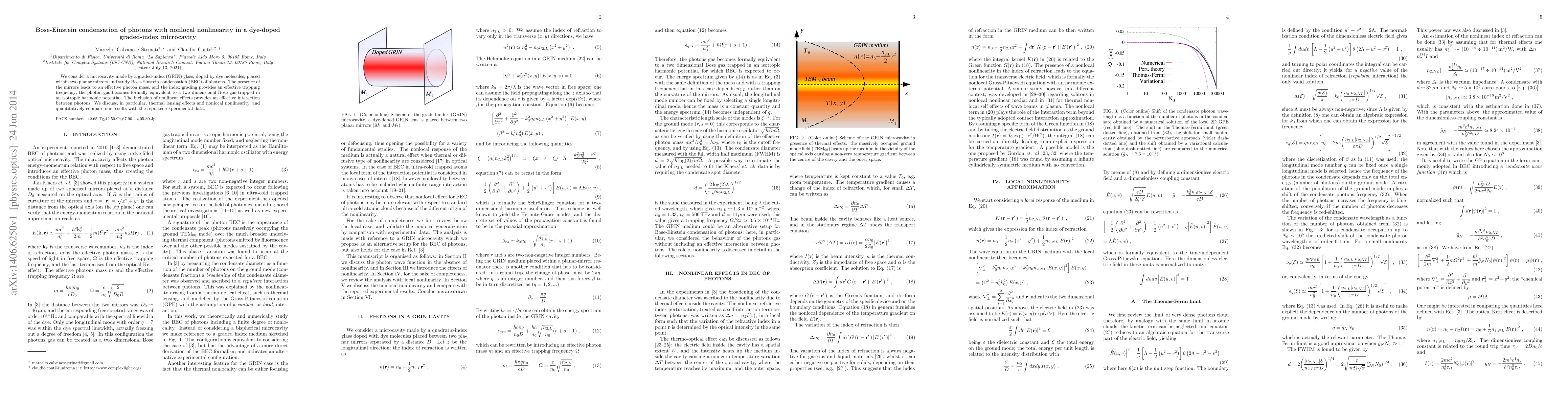 We consider a microcavity made by a graded-index (GRIN) glass, doped by dye molecules, placed within two planar mirrors and study Bose-Einstein condensation (BEC) of photons. The presence of the mirrors leads to an effective photon mass, and the index grading provides an effective trapping frequency; the photon gas becomes formally equivalent to a two dimensional Bose gas trapped in an isotropic harmonic potential. The inclusion of nonlinear effects provides an effective interaction between photons. We discuss, in particular, thermal lensing effects and nonlocal nonlinearity, and quantitatively compare our results with the reported experimental data.