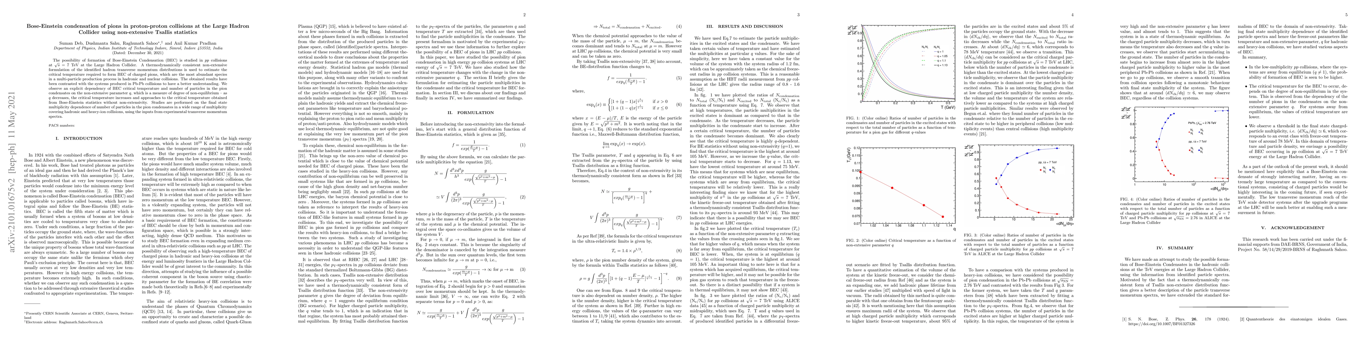 This study investigates the formation of Bose-Einstein Condensation (BEC) in proton-proton collisions at the Large Hadron Collider using non-extensive Tsallis statistics. The research estimates the critical temperature for BEC of charged pions, finding a dependency on the non-extensive parameter $q$ that influences the critical temperature and number of pions in the condensate.