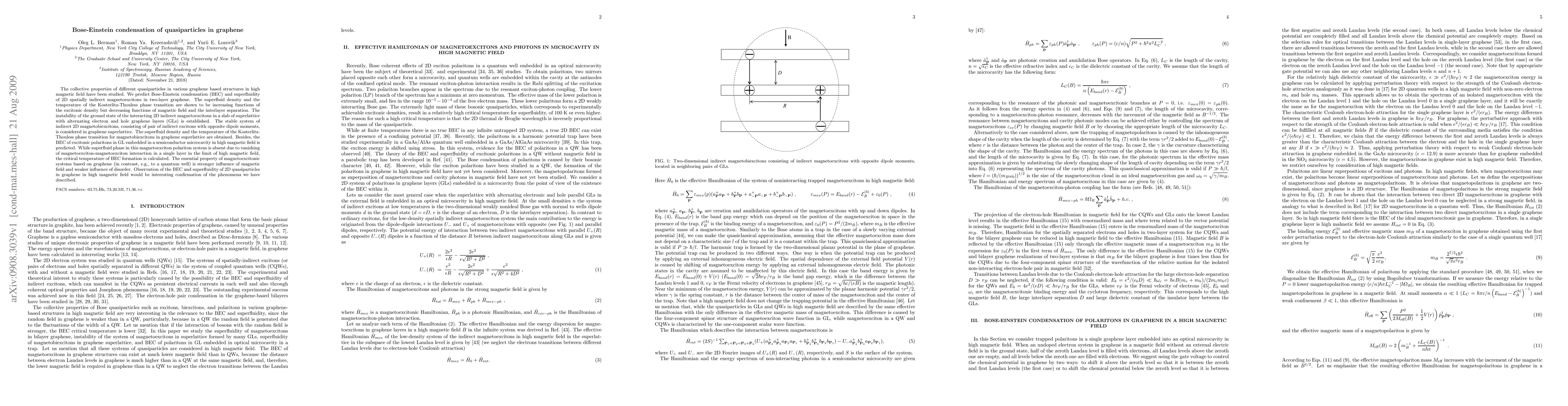 The collective properties of different quasiparticles in various graphene based structures in high magnetic field have been studied. We predict Bose-Einstein condensation (BEC) and superfluidity of 2D spatially indirect magnetoexcitons in two-layer graphene. The superfluid density and the temperature of the Kosterlitz-Thouless phase transition are shown to be increasing functions of the excitonic density but decreasing functions of magnetic field and the interlayer separation. The instability of the ground state of the interacting 2D indirect magnetoexcitons in a slab of superlattice with alternating electron and hole graphene layers (GLs) is established. The stable system of indirect 2D magnetobiexcitons, consisting of pair of indirect excitons with opposite dipole moments, is considered in graphene superlattice. The superfluid density and the temperature of the Kosterlitz-Thouless phase transition for magnetobiexcitons in graphene superlattice are obtained. Besides, the BEC of excitonic polaritons in GL embedded in a semiconductor microcavity in high magnetic field is predicted. While superfluid phase in this magnetoexciton polariton system is absent due to vanishing of magnetoexciton-magnetoexciton interaction in a single layer in the limit of high magnetic field, the critical temperature of BEC formation is calculated. The essential property of magnetoexcitonic systems based on graphene (in contrast, e.g., to a quantum well) is stronger influence of magnetic field and weaker influence of disorder. Observation of the BEC and superfluidity of 2D quasiparticles in graphene in high magnetic field would be interesting confirmation of the phenomena we have described.