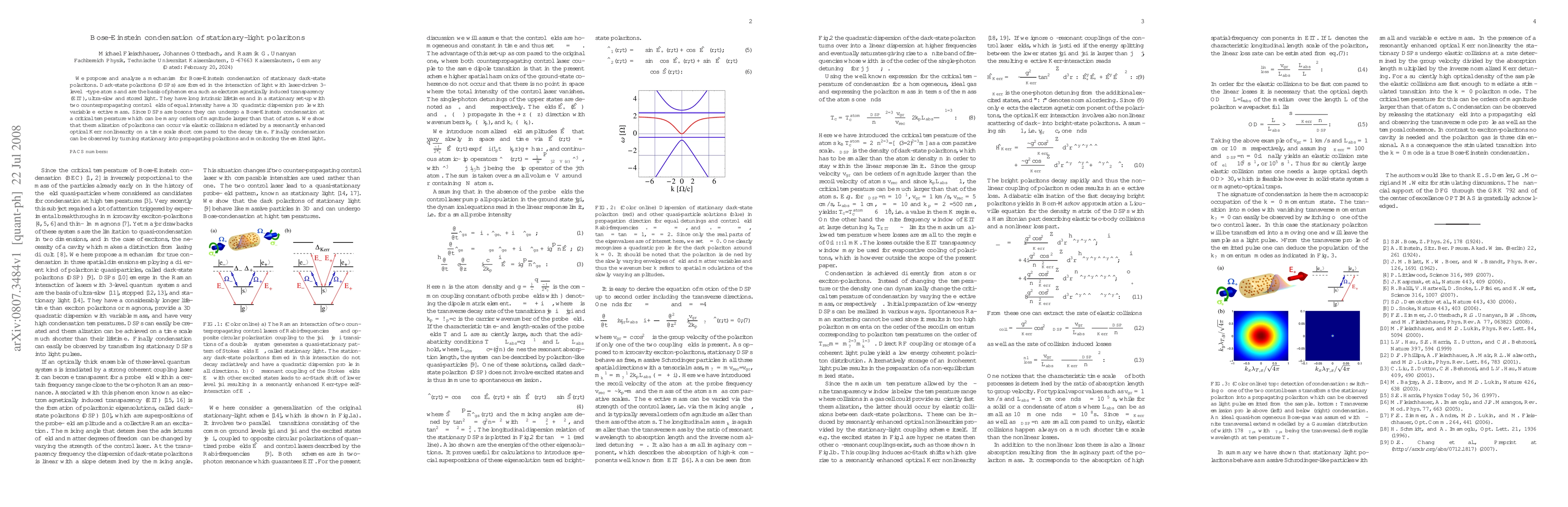 This research proposes a mechanism for Bose-Einstein condensation in stationary dark-state polaritons, which are formed from light interacting with laser-driven atoms. The study demonstrates that these polaritons, with their long lifetimes and unique dispersion, can condense at much higher temperatures than atoms, and thermalization can occur via elastic collisions enhanced by optical nonlinearity.