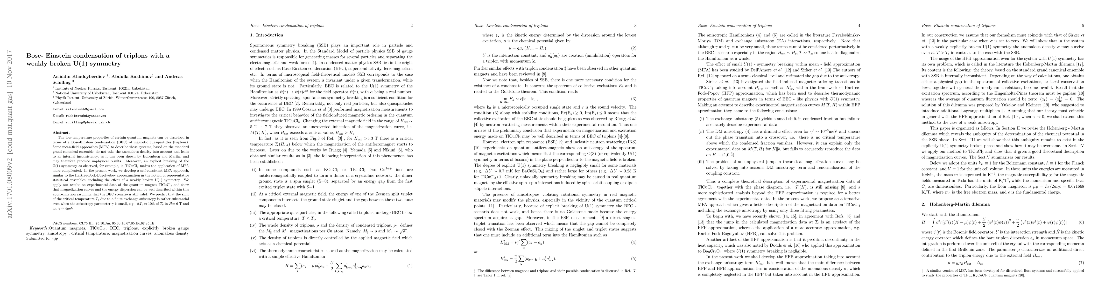 This paper develops a self-consistent mean-field approach to describe the Bose-Einstein condensation of triplons in quantum magnets with weakly broken U(1) symmetry, addressing the limitations of previous methods. The new approach successfully explains experimental data for TlCuCl3, predicting significant shifts in critical temperature due to small exchange anisotropy.