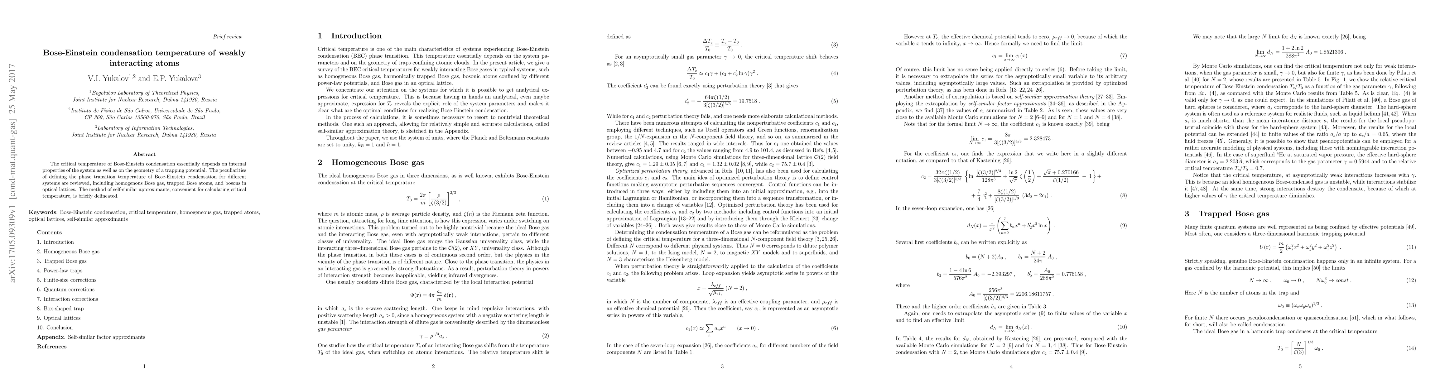 This paper reviews the factors influencing the critical temperature for Bose-Einstein condensation, focusing on homogenous Bose gas, trapped Bose atoms, and bosons in optical lattices, while detailing the self-similar approximants method for calculating these temperatures.