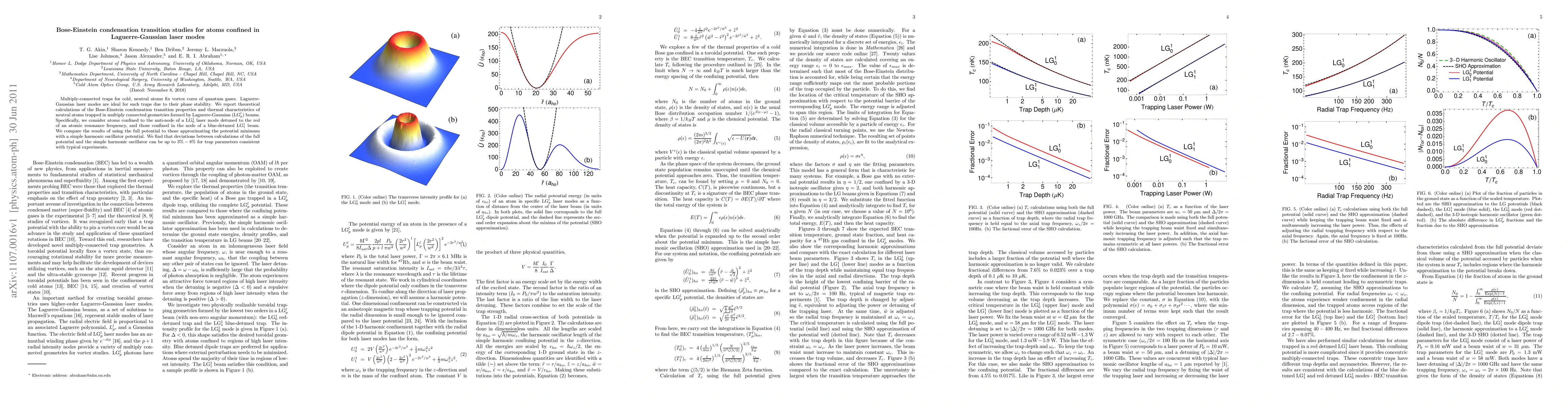 This paper investigates the Bose-Einstein condensation transition properties of neutral atoms confined in Laguerre-Gaussian laser modes, focusing on multiply-connected traps. It compares theoretical calculations using the full potential with those using a simple harmonic oscillator approximation, finding deviations of up to 8% for typical experimental parameters.