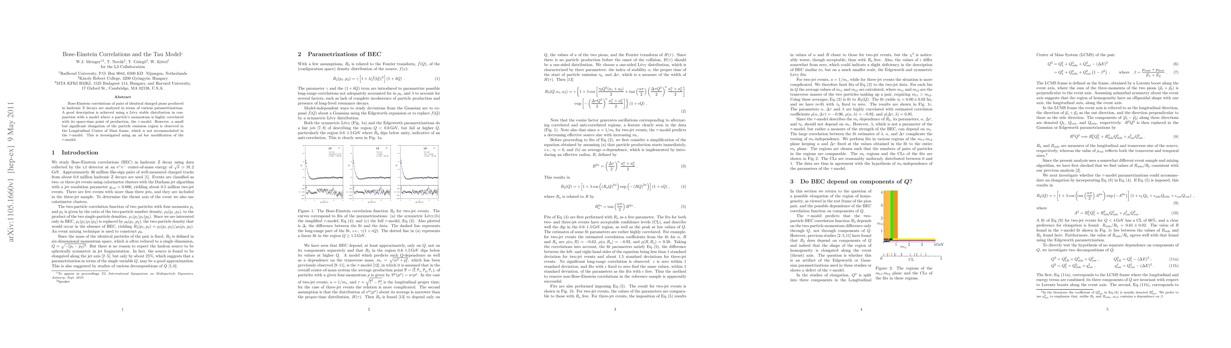 This paper analyzes Bose-Einstein correlations of identical charged pions from Z decays using a L\'evy stable distribution and the tau model, finding good agreement but noting an elongation in the emission region not accounted for by the tau model, which is addressed with an ad hoc modification.