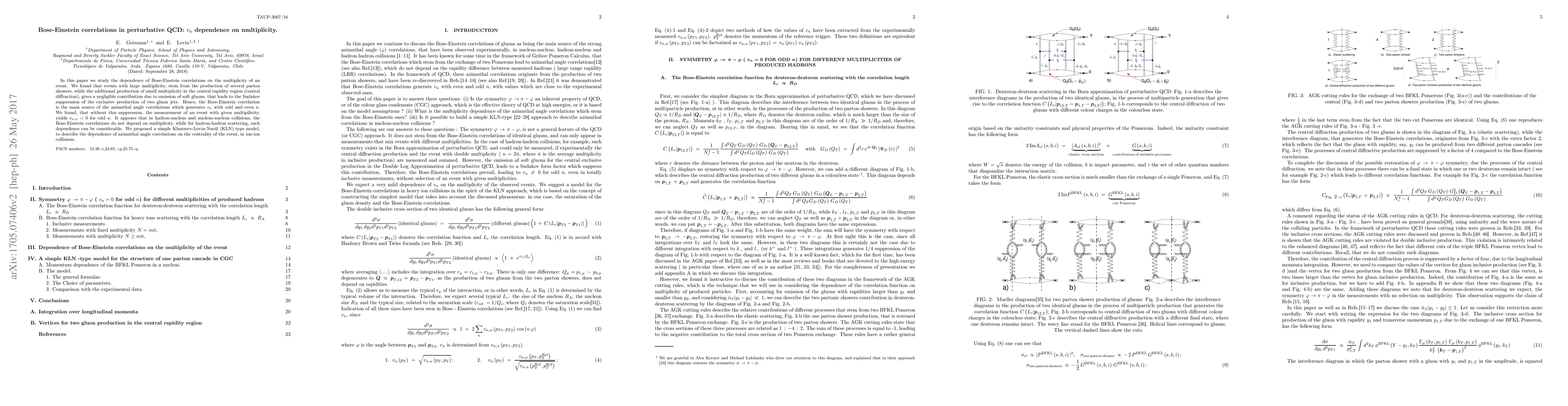 This paper investigates Bose-Einstein correlations in perturbative QCD, finding that large multiplicity events arise from multiple parton showers, while small multiplicity central diffraction contributes minimally due to soft gluon emission. The study proposes a KLN model to describe azimuthal angle correlations in ion-ion collisions.