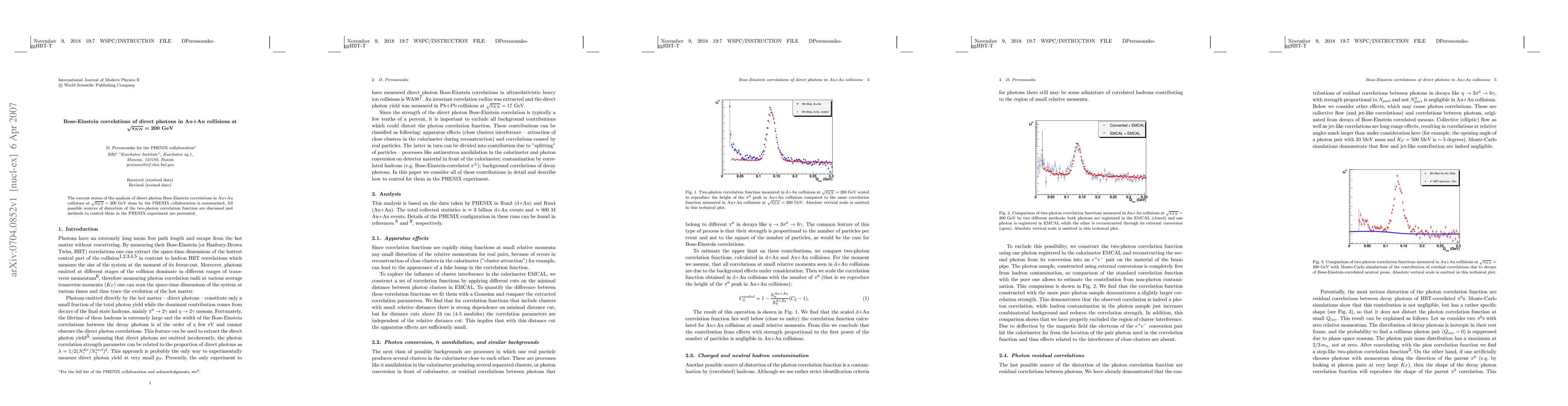 This paper summarizes the PHENIX collaboration's analysis of direct photon Bose-Einstein correlations in Au+Au collisions at $\sqrt{s_{NN}} = 200$ GeV. It discusses potential sources of distortion in the two-photon correlation function and outlines methods used to control these distortions in the PHENIX experiment.