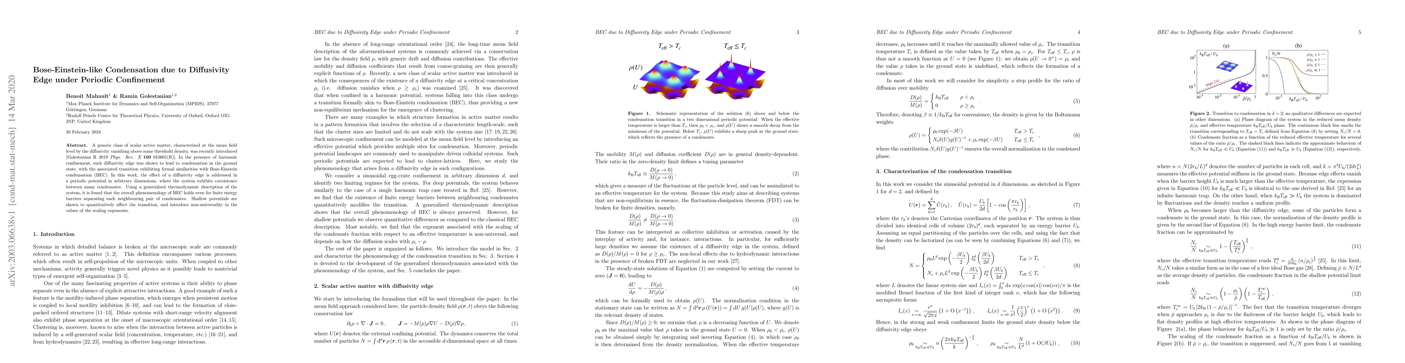 A generic class of scalar active matter, characterized at the mean field level by the diffusivity vanishing above some threshold density, was recently introduced [Golestanian R 2019 Phys. Rev. E 100 010601(R)]. In the presence of harmonic confinement, such 'diffusivity edge' was shown to lead to condensation in the ground state, with the associated transition exhibiting formal similarities with Bose-Einstein condensation (BEC). In this work, the effect of a diffusivity edge is addressed in a periodic potential in arbitrary dimensions, where the system exhibits coexistence between many condensates. Using a generalized thermodynamic description of the system, it is found that the overall phenomenology of BEC holds even for finite energy barriers separating each neighbouring pair of condensates. Shallow potentials are shown to quantitatively affect the transition, and introduce non-universality in the values of the scaling exponents.