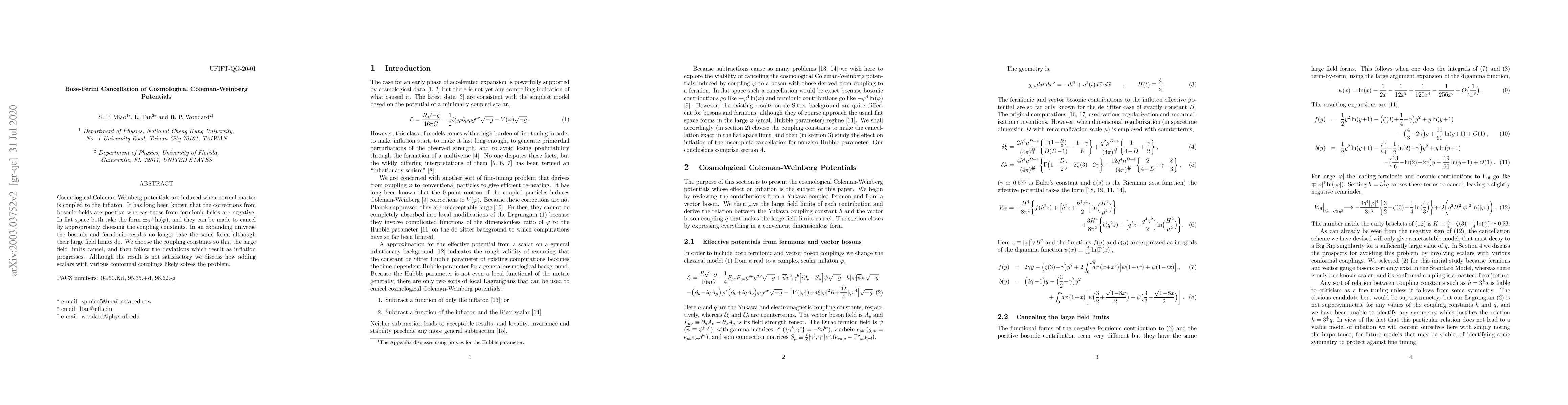 This paper explores the cancellation of cosmological Coleman-Weinberg potentials induced by bosonic and fermionic fields in an expanding universe, showing that while their large field limits can cancel, deviations arise during inflation. The authors suggest that introducing scalars with specific conformal couplings may resolve these deviations.