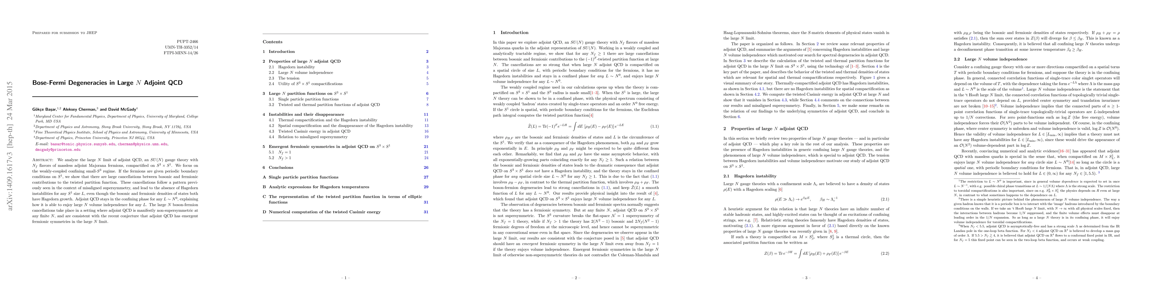 This paper investigates the large $N$ limit of adjoint QCD, revealing significant cancellations between bosonic and fermionic contributions in the weakly-coupled regime, leading to the absence of Hagedorn instabilities and maintaining the confining phase for any $L \sim N^0$. These cancellations support the conjecture of emergent fermionic symmetries in adjoint QCD.