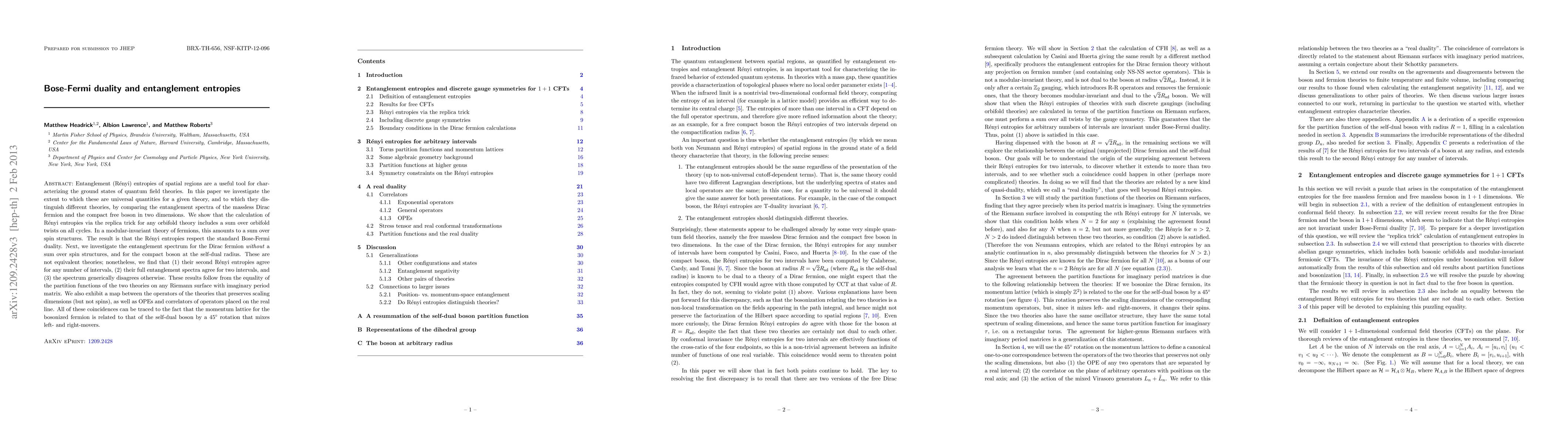 Entanglement (Renyi) entropies of spatial regions are a useful tool for characterizing the ground states of quantum field theories. In this paper we investigate the extent to which these are universal quantities for a given theory, and to which they distinguish different theories, by comparing the entanglement spectra of the massless Dirac fermion and the compact free boson in two dimensions. We show that the calculation of Renyi entropies via the replica trick for any orbifold theory includes a sum over orbifold twists on all cycles. In a modular-invariant theory of fermions, this amounts to a sum over spin structures. The result is that the Renyi entropies respect the standard Bose-Fermi duality. Next, we investigate the entanglement spectrum for the Dirac fermion without a sum over spin structures, and for the compact boson at the self-dual radius. These are not equivalent theories; nonetheless, we find that (1) their second Renyi entropies agree for any number of intervals, (2) their full entanglement spectra agree for two intervals, and (3) the spectrum generically disagrees otherwise. These results follow from the equality of the partition functions of the two theories on any Riemann surface with imaginary period matrix. We also exhibit a map between the operators of the theories that preserves scaling dimensions (but not spins), as well as OPEs and correlators of operators placed on the real line. All of these coincidences can be traced to the fact that the momentum lattice for the bosonized fermion is related to that of the self-dual boson by a 45 degree rotation that mixes left- and right-movers.