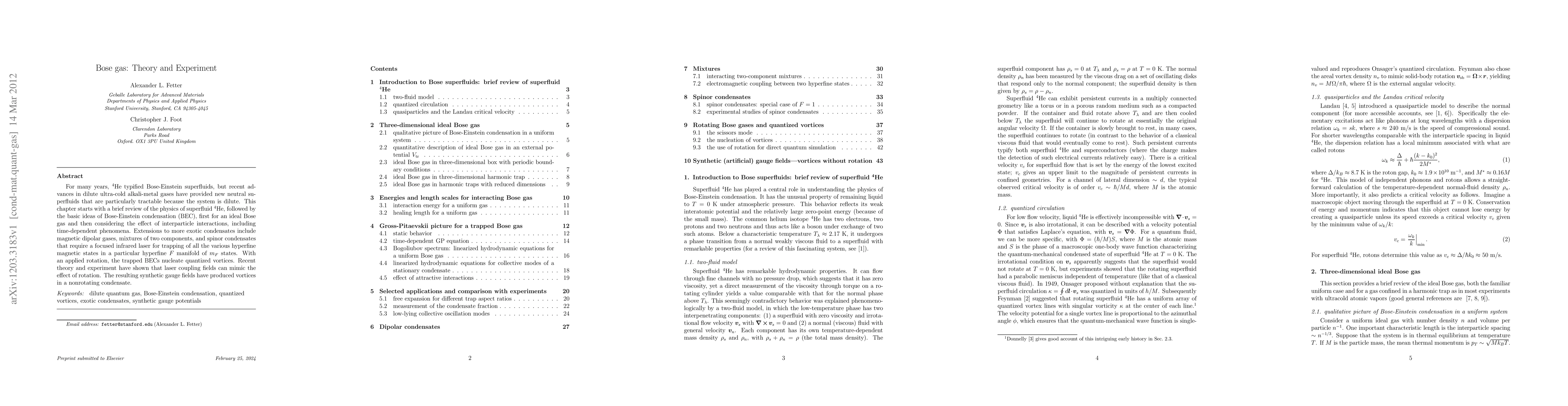 For many years, $^4$He typified Bose-Einstein superfluids, but recent advances in dilute ultra-cold alkali-metal gases have provided new neutral superfluids that are particularly tractable because the system is dilute. This chapter starts with a brief review of the physics of superfluid $^4$He, followed by the basic ideas of Bose-Einstein condensation (BEC), first for an ideal Bose gas and then considering the effect of interparticle interactions, including time-dependent phenomena. Extensions to more exotic condensates include magnetic dipolar gases, mixtures of two components, and spinor condensates that require a focused infrared laser for trapping of all the various hyperfine magnetic states in a particular hyperfine $F$ manifold of $m_F$ states. With an applied rotation, the trapped BECs nucleate quantized vortices. Recent theory and experiment have shown that laser coupling fields can mimic the effect of rotation. The resulting synthetic gauge fields have produced vortices in a nonrotating condensate.