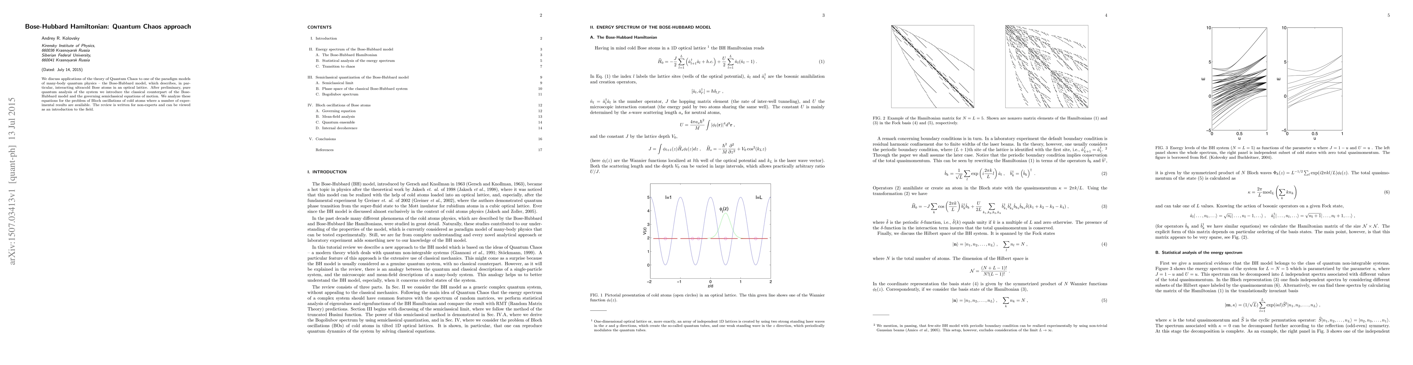 This paper applies Quantum Chaos theory to the Bose-Hubbard model, a fundamental many-body quantum physics model for interacting ultracold Bose atoms in optical lattices. It introduces the classical counterpart and semiclassical equations of motion, analyzing them in the context of Bloch oscillations, with a focus on experimental results.
