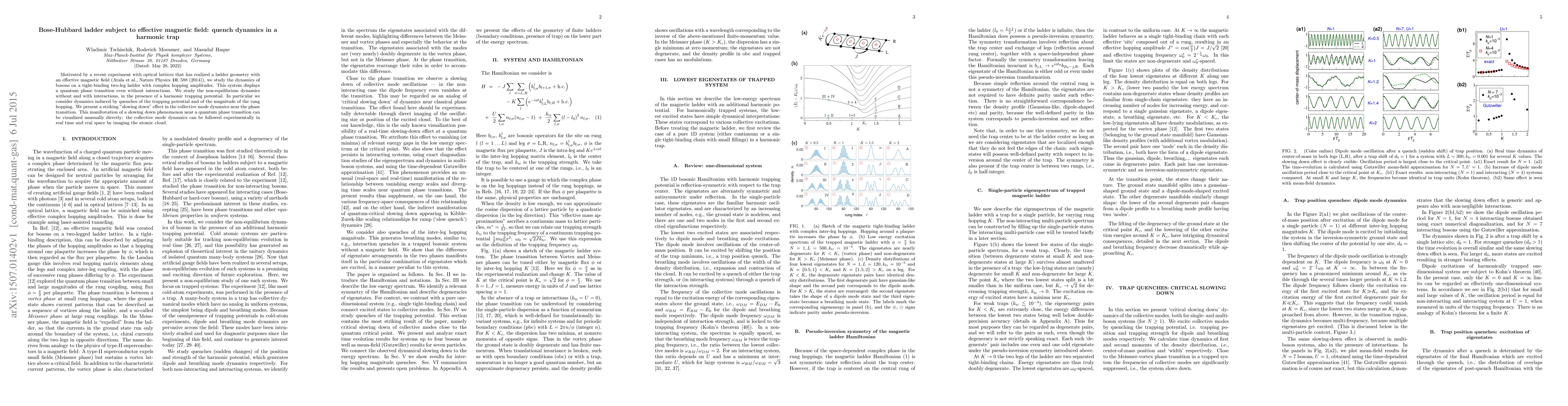 Motivated by a recent experiment with optical lattices that has realized a ladder geometry with an effective magnetic field (Atala et al., Nature Physics \textbf{10}, 588 (2014)), we study the dynamics of bosons on a tight-binding two-leg ladder with complex hopping amplitudes. This system displays a quantum phase transition even without interactions. We study the non-equilibrium dynamics without and with interactions, in the presence of a harmonic trapping potential. In particular we consider dynamics induced by quenches of the trapping potential and of the magnitude of the rung hopping. We present a striking "slowing down" effect in the collective mode dynamics near the phase transition. This manifestation of a slowing down phenomenon near a quantum phase transition can be visualized unusually directly: the collective mode dynamics can be followed experimentally in real time and real space by imaging the atomic cloud.
